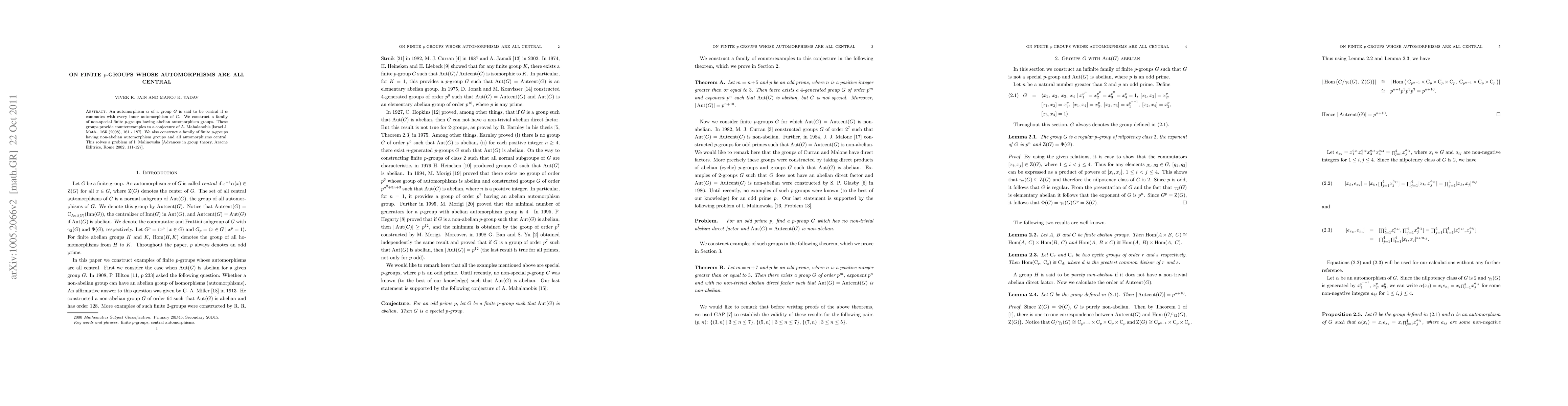 An automorphism $\alpha$ of a group $G$ is said to be central if $\alpha$ commutes with every inner automorphism of $G$. We construct a family of non-special finite $p$-groups having abelian automorphism groups. These groups provide counter examples to a conjecture of A. Mahalanobis [Israel J. Math., {\bf 165} (2008), 161 - 187]. We also construct a family of finite $p$-groups having non-abelian automorphism groups and all automorphisms central. This solves a problem of I. Malinowska [Advances in group theory, Aracne Editrice, Rome 2002, 111-127].