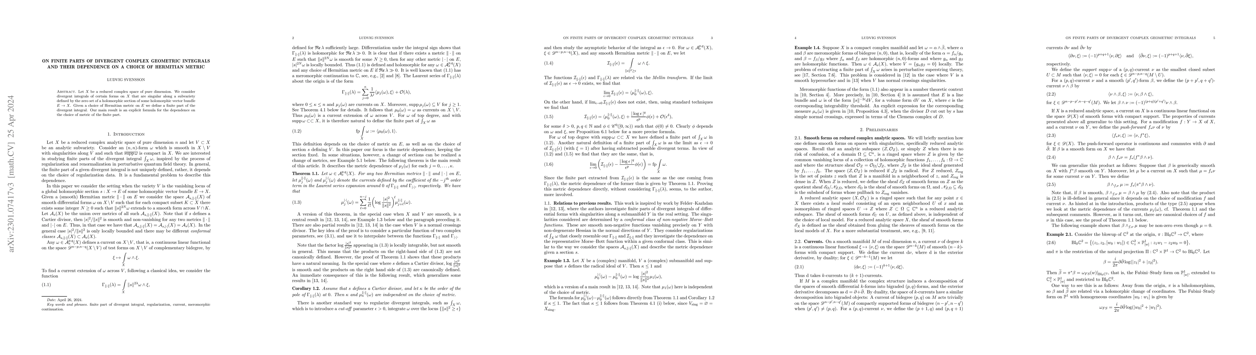 This paper explores finite parts of divergent geometric integrals on reduced complex spaces, focusing on forms singular along subvarieties defined by holomorphic sections. It establishes an explicit formula showing how these finite parts depend on the chosen Hermitian metric on the associated vector bundle.