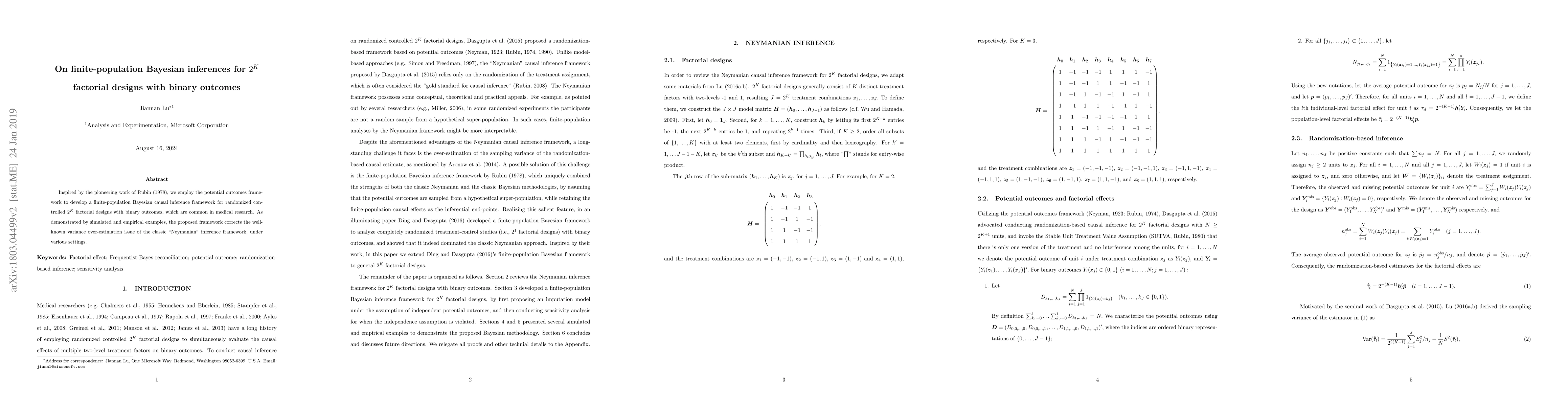 This paper develops a finite-population Bayesian causal inference framework for $2^K$ factorial designs with binary outcomes, addressing the variance over-estimation issue of traditional "Neymanian" inference methods through simulated and empirical examples.