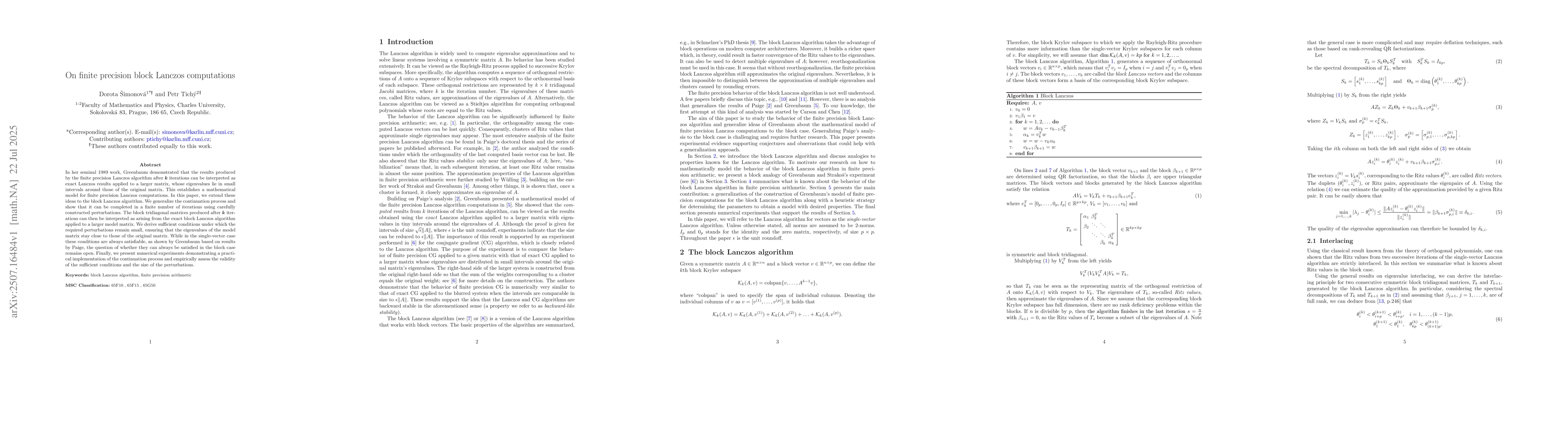 The paper extends Greenbaum's continuation process for finite precision Lanczos computations to the block Lanczos algorithm, ensuring that the continuation process terminates with βN+1 = 0, yielding a final block tridiagonal matrix TN. It introduces carefully designed perturbations to maintain small perturbations during the continuation process under an additional assumption.