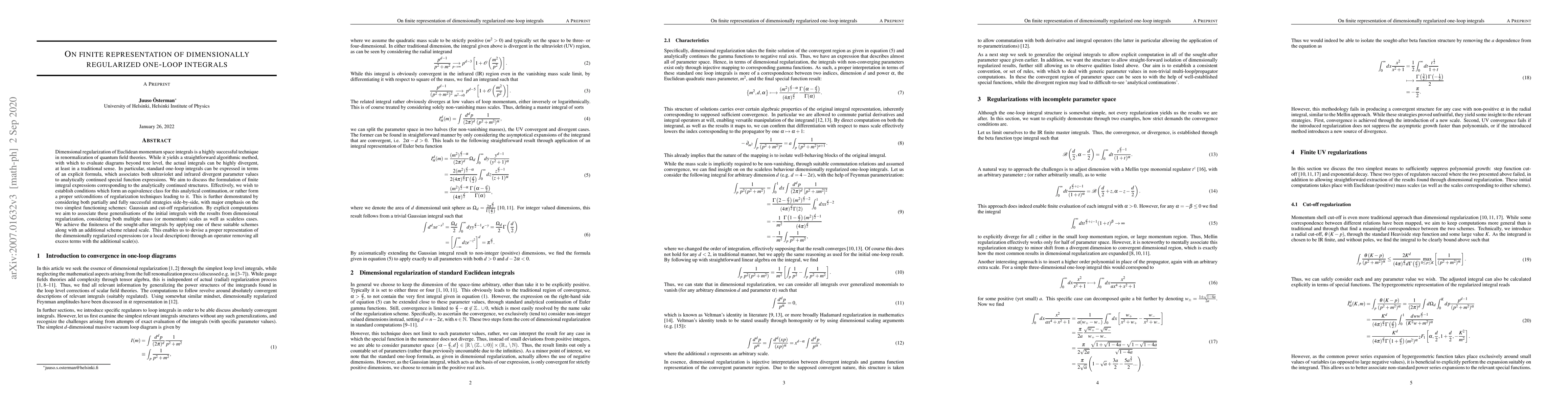 Dimensional regularization of Euclidean momentum space integrals is a highly successful technique in renormalization of quantum field theories. While it yields a straightforward algorithmic method, with which to evaluate diagrams beyond tree level, the actual integrals can be highly divergent, at least in a traditional sense. In particular, standard one-loop integrals can be expressed in terms of an explicit formula, which associates both ultraviolet and infrared divergent parameter values to analytically continued special function expressions. We aim to discuss the formulation of finite integral expressions corresponding to the analytically continued structures. Effectively, we wish to establish conditions which form an equivalence class for this analytical continuation, or rather form a proper set/conditions of regularization techniques leading to it. This is further demonstrated by considering both partially and fully successful strategies side-by-side, with major emphasis on the two simplest functioning schemes: Gaussian and cut-off regularization. By explicit computations we aim to associate these generalisations of the initial integrals with the results from dimensional regularization, considering both multiple mass (or momentum) scales as well as scaleless cases. We achieve the finiteness of the sought-after integrals by applying one of these suitable schemes along with an additional scheme related scale. This enables us to devise a proper representation of the dimensionally regularized expressions (or a local description) through an operator removing all excess terms with the additional scale(s).