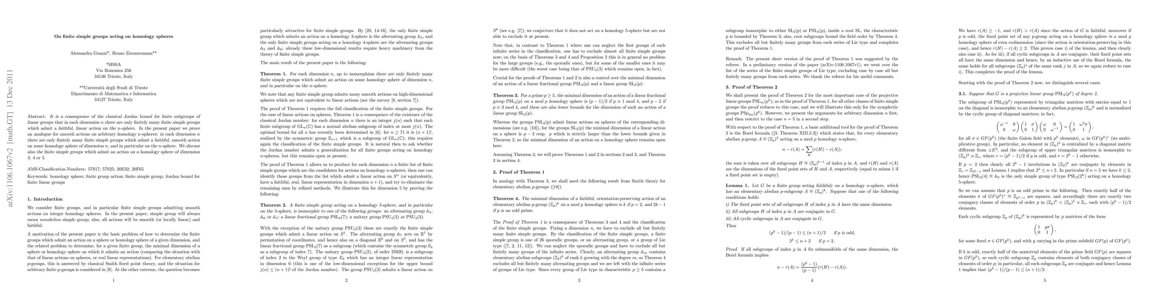 This paper establishes that in each dimension n, only a finite number of finite simple groups can act faithfully and smoothly on any homology n-sphere, extending the classical Jordan bound for linear actions to smooth actions. It specifically examines the actions on homology spheres of dimensions 3, 4, and 5.