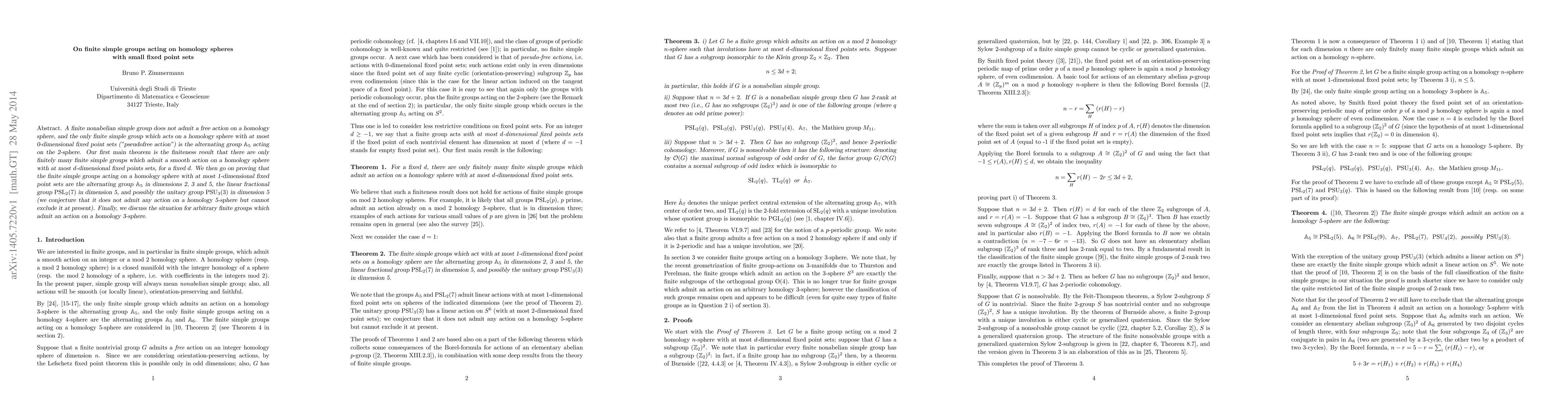 This paper proves that only finitely many finite simple groups can act smoothly on homology spheres with fixed point sets of a given dimension. It identifies specific finite simple groups, including A_5 and PSL_2(7), that act on homology spheres with at most 1-dimensional fixed point sets.