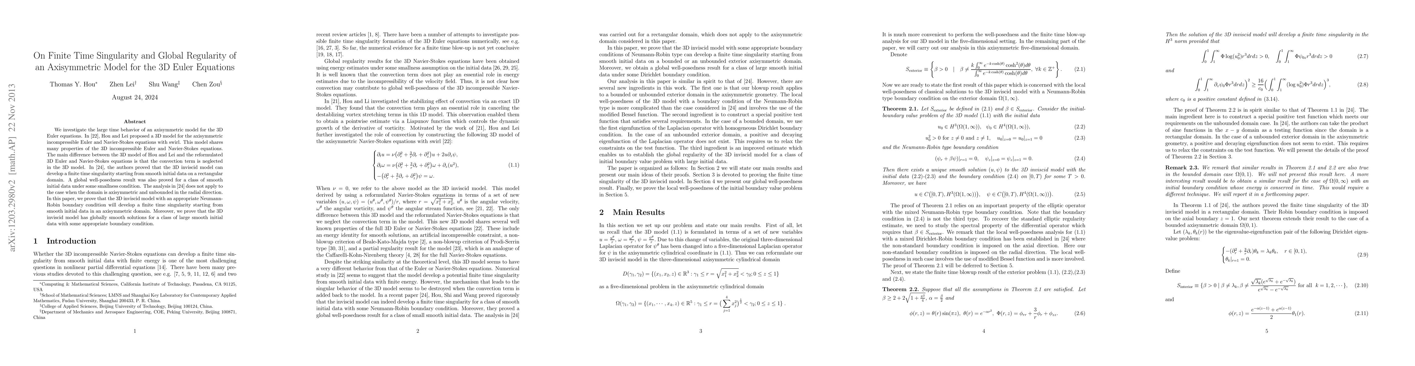 This paper investigates the large time behavior of an axisymmetric model for the 3D Euler equations, showing that it can develop a finite time singularity under certain conditions, while also proving global regularity for large smooth initial data with appropriate boundary conditions.