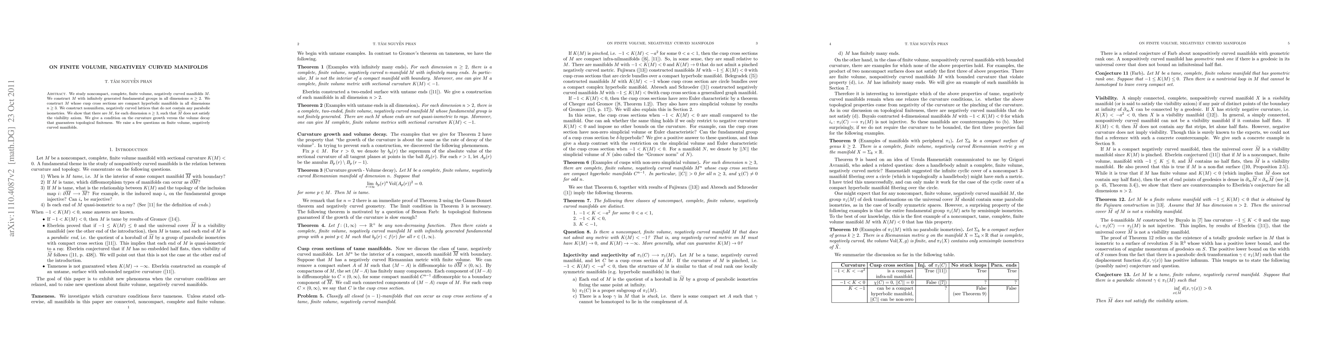 This paper explores noncompact, finite volume, negatively curved manifolds with infinitely generated fundamental groups and discusses the properties of their cusp cross sections. It also investigates conditions for topological finiteness and raises several questions regarding the curvature and volume decay in such manifolds.