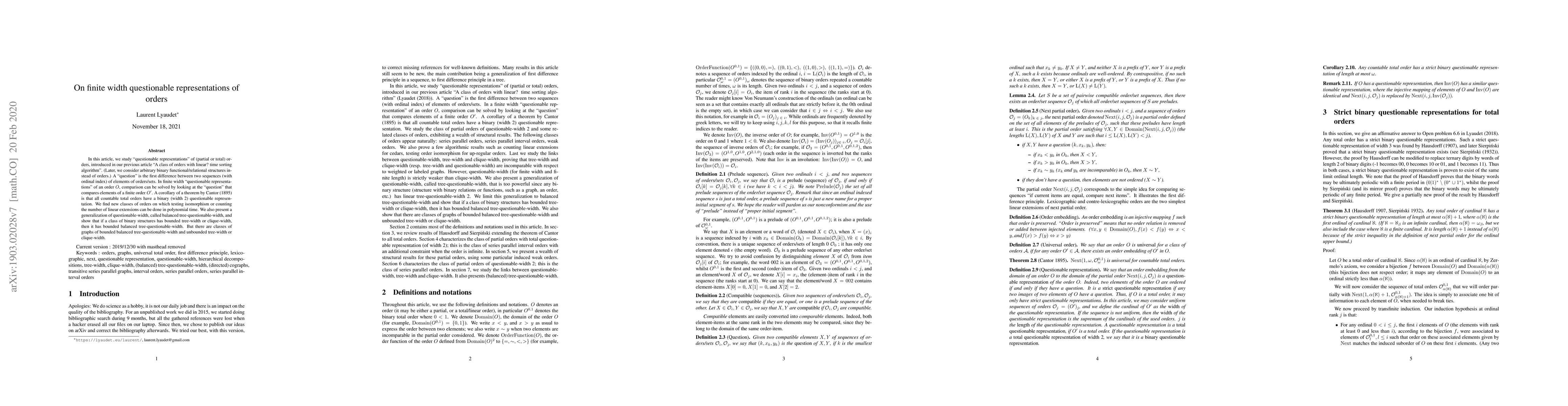 The paper studies 'questionable representations' of (partial or total) orders, focusing on finite width representations where comparison can be solved by examining the 'question' between elements of a finite order.