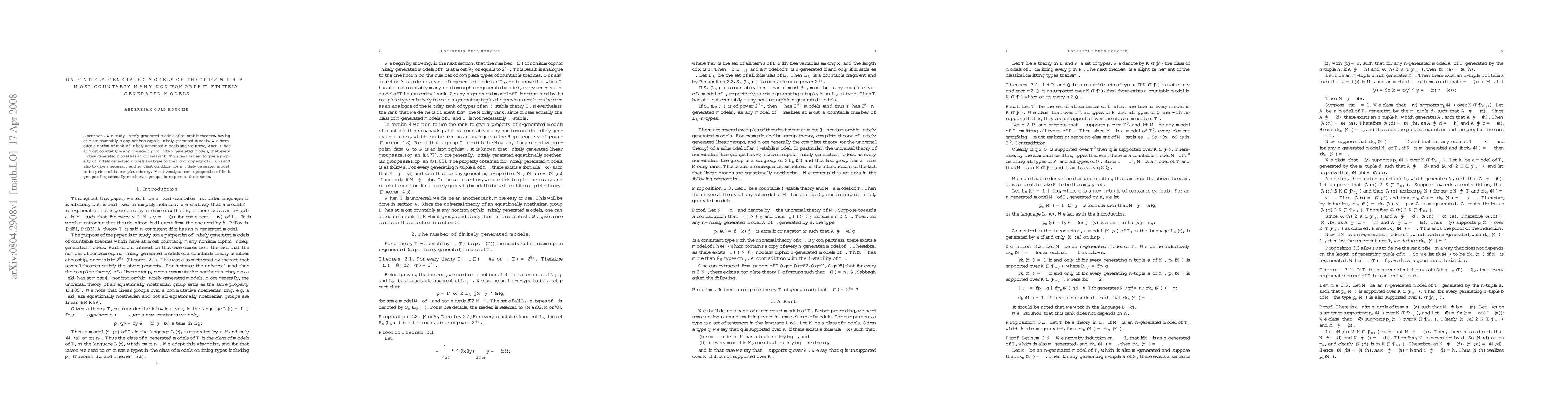We study finitely generated models of countable theories, having at most countably many nonisomorphic finitely generated models. We intro- duce a notion of rank of finitely generated models and we prove, when T has at most countably many nonisomorphic finitely generated models, that every finitely generated model has an ordinal rank. This rank is used to give a prop- erty of finitely generated models analogue to the Hopf property of groups and also to give a necessary and sufficient condition for a finitely generated model to be prime of its complete theory. We investigate some properties of limit groups of equationally noetherian groups, in respect to their ranks.