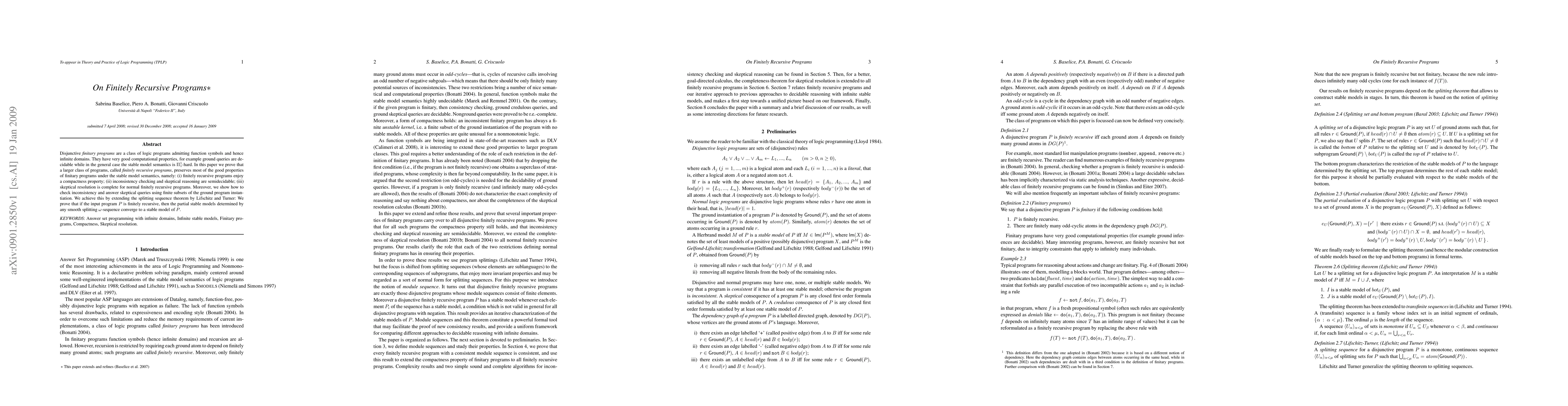 This paper explores finitely recursive programs, a class that maintains favorable computational properties similar to disjunctive finitary programs, including decidability of ground queries and semidecidability of inconsistency checking, while ensuring skeptical resolution completeness for normal programs. The authors demonstrate that these properties are preserved through a refined stable model semantics and finite instantiation techniques.