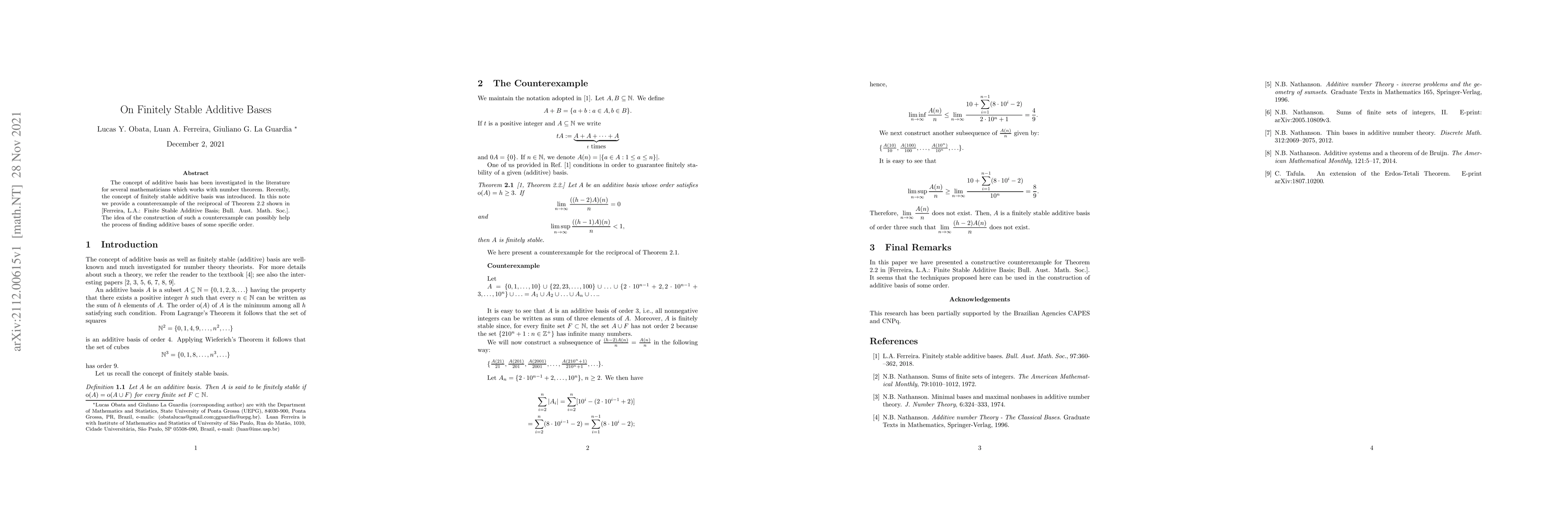 This paper presents a counterexample disproving the reciprocal of Theorem 2.2 in Ferreira's work on finitely stable additive bases, and suggests that the methodology used may aid in discovering additive bases of particular orders.