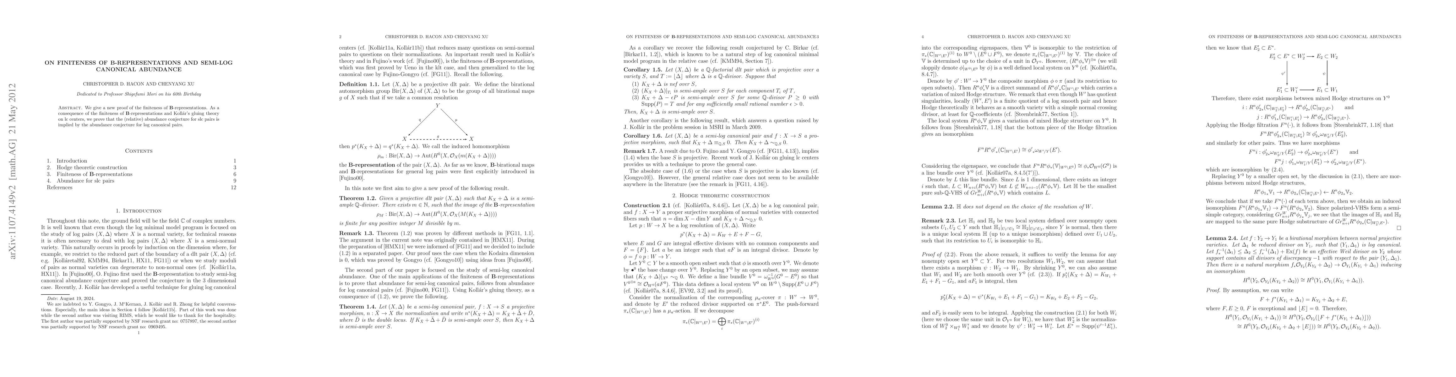 We give a new proof of the finiteness of B-representations. As a consequence of the finiteness of B-representations and Koll\'ar's gluing theory on lc centers, we prove that the (relative) abundance conjecture for slc pairs is implied by the abundance conjecture for log canonical pairs.
