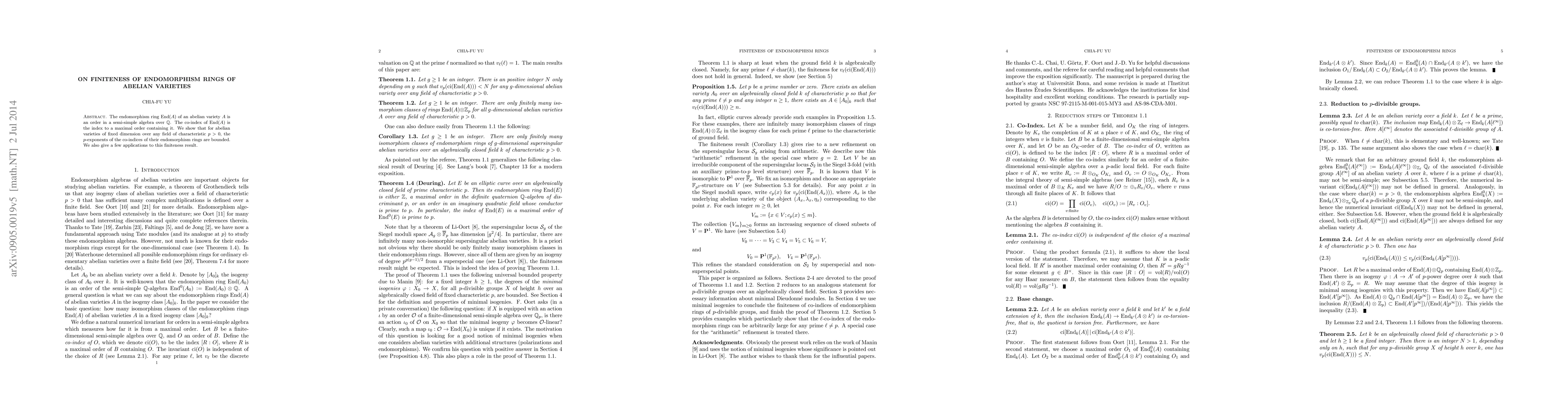 The paper establishes that the p-exponents of the co-indices of endomorphism rings for abelian varieties of fixed dimension over fields of characteristic p>0 are bounded, contributing to the finiteness of these rings. This result has several applications within the study of abelian varieties.