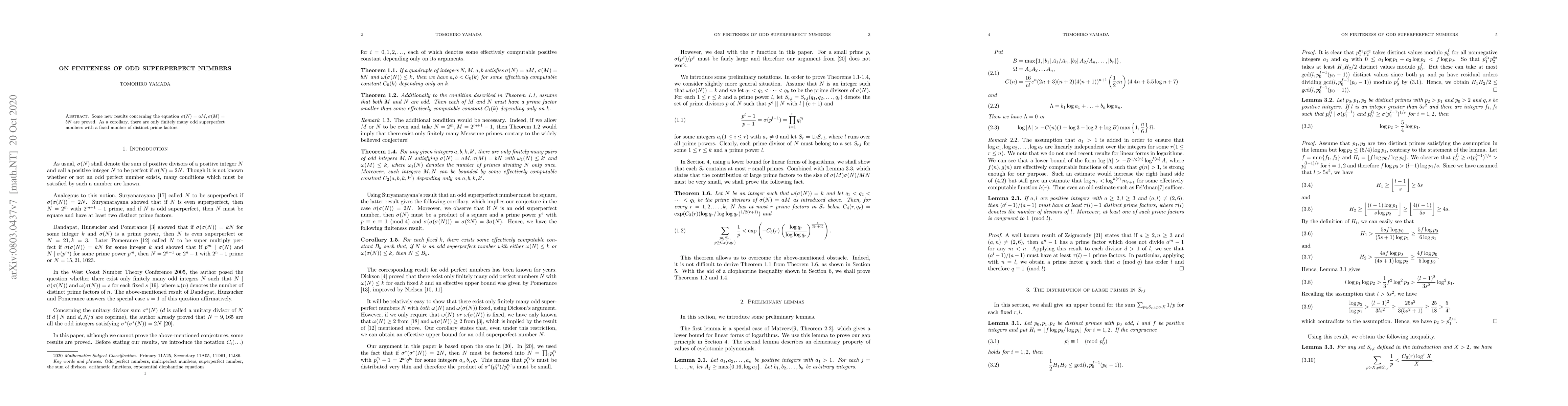 Some new results concerning the equation $\sigma(N)=aM, \sigma(M)=bN$ are proved. As a corollary, there are only finitely many odd superperfect numbers with a fixed number of distinct prime factors.