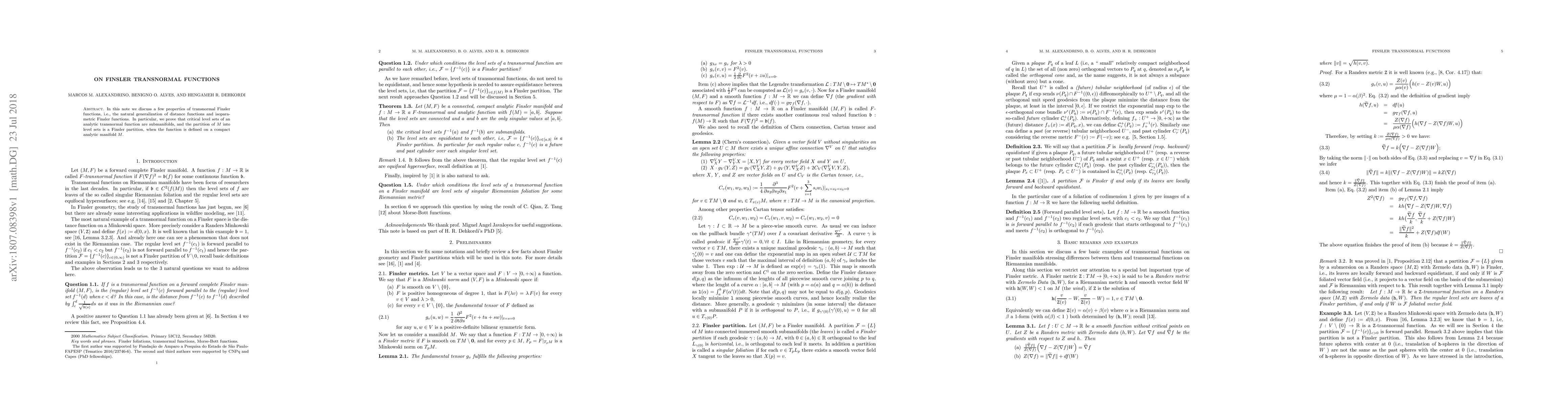This paper explores properties of transnormal Finsler functions, generalizing distance functions. It proves that critical level sets of an analytic transnormal function are submanifolds, and when defined on a compact analytic manifold, the function's level sets partition the manifold in a Finsler manner.