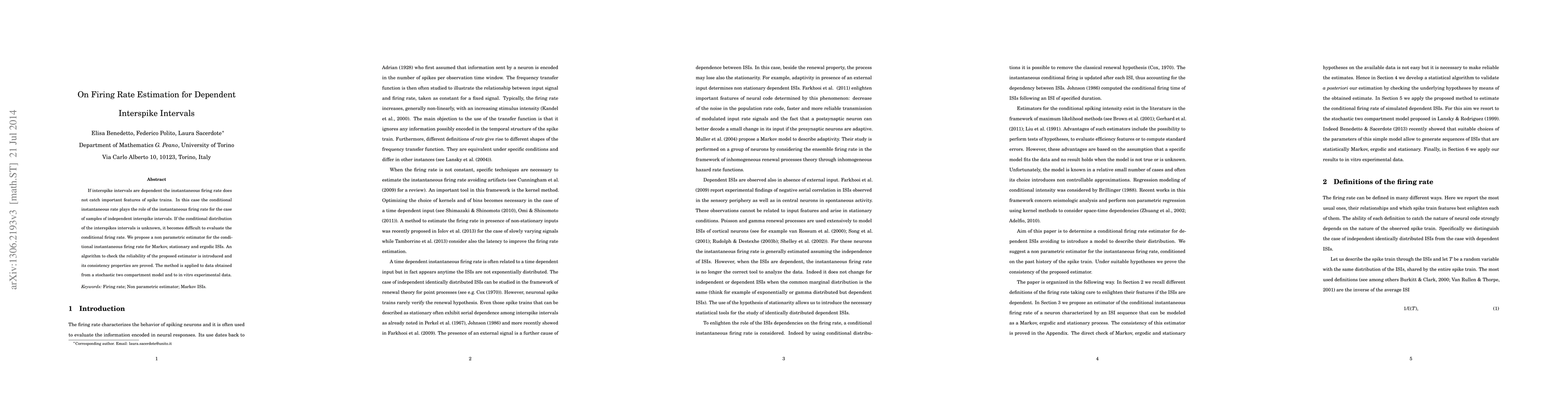 This paper proposes a non-parametric estimator for the conditional instantaneous firing rate when interspike intervals are dependent, addressing the limitations of the traditional firing rate. The method is validated through an algorithm and applied to both a stochastic model and experimental data.