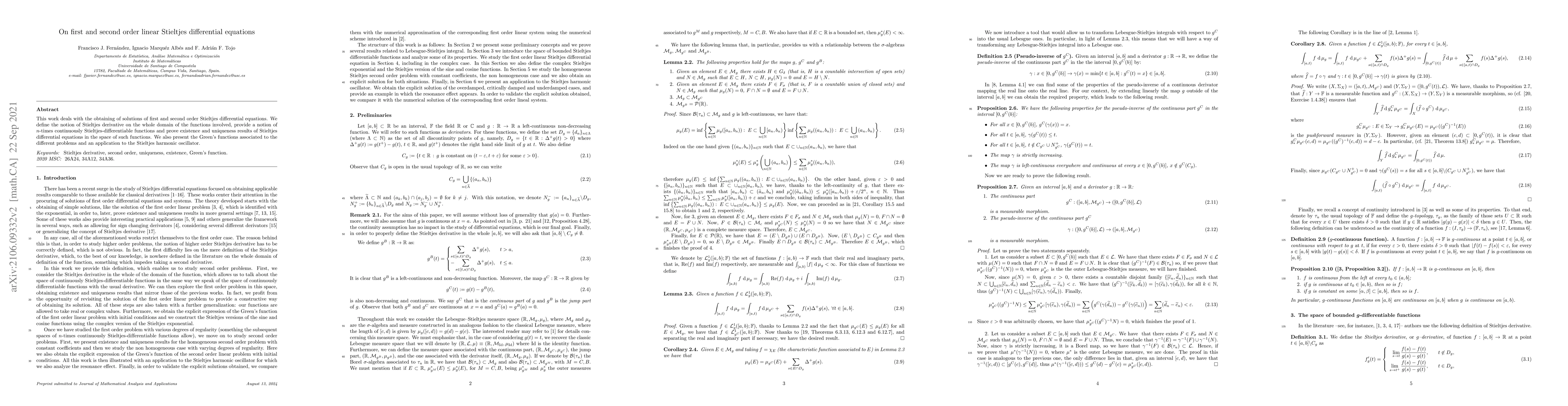 This paper develops solutions for first and second order Stieltjes differential equations, establishes n-times continuously Stieltjes-differentiable functions, and proves existence and uniqueness theorems, while also introducing Green's functions and applying these methods to a Stieltjes harmonic oscillator.