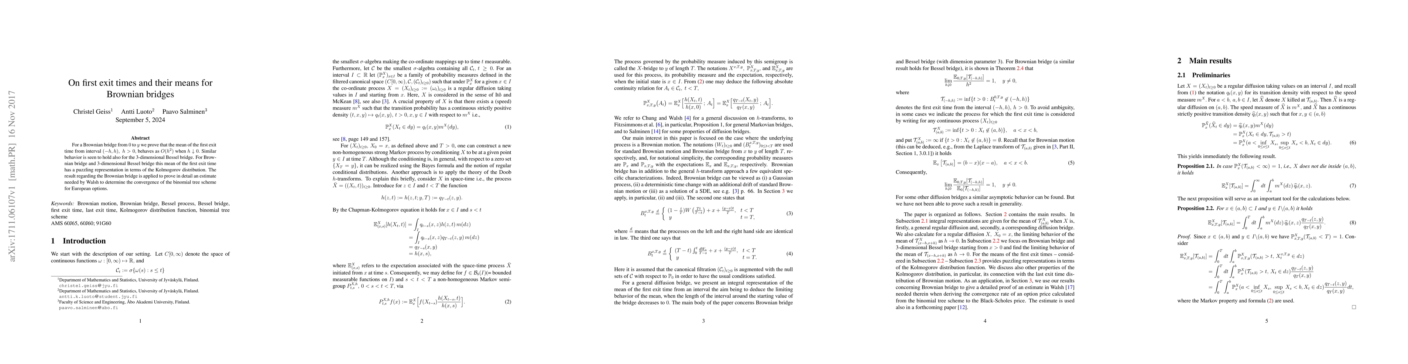 For a Brownian bridge from $0$ to $y$ we prove that the mean of the first exit time from interval $(-h,h), \,\, h>0,$ behaves as $O(h^2)$ when $h \downarrow 0.$ Similar behavior is seen to hold also for the 3-dimensional Bessel bridge. For Brownian bridge and 3-dimensional Bessel bridge this mean of the first exit time has a puzzling representation in terms of the Kolmogorov distribution. The result regarding the Brownian bridge is applied to prove in detail an estimate needed by Walsh to determine the convergence of the binomial tree scheme for European options.