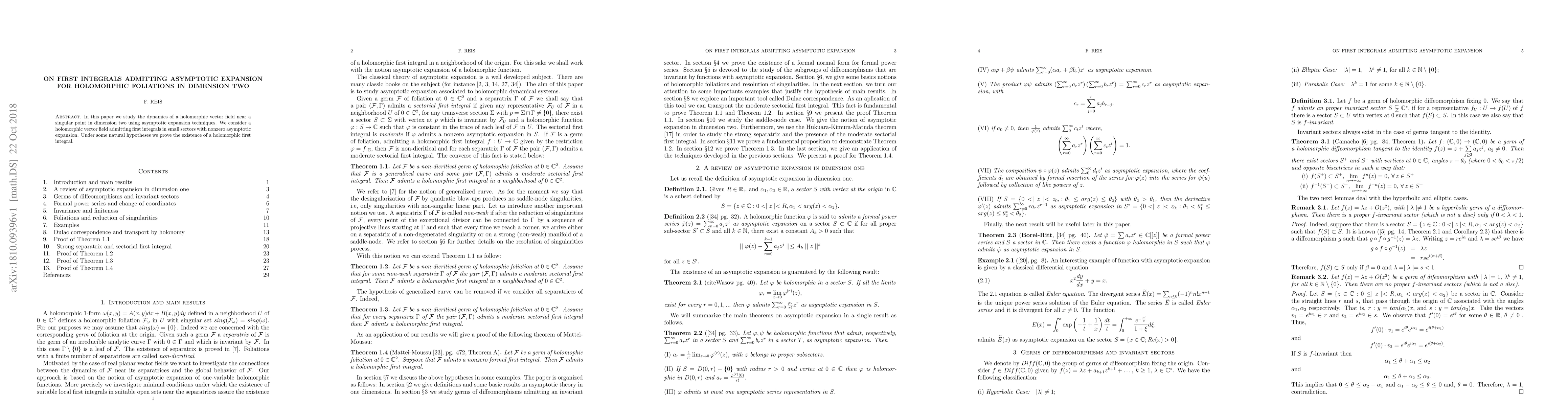 Summary: This paper investigates the dynamics of holomorphic vector fields near singular points in two dimensions using asymptotic expansion techniques. It proves the existence of a holomorphic first integral under certain conditions for vector fields admitting first integrals with nonzero asymptotic expansion.