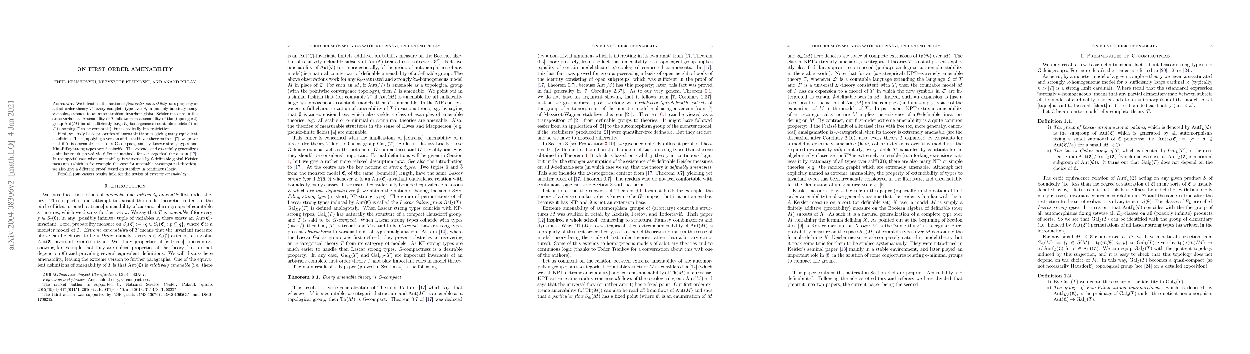 This paper introduces the concept of first order amenability for a first-order theory, where every complete type over the empty set extends to an automorphism-invariant global Keisler measure. It establishes that amenability is less restrictive than the amenability of the automorphism group of large countable models and provides equivalent conditions for it. The paper also proves that amenable theories are G-compact and discusses the notion of extreme amenability with parallel results.