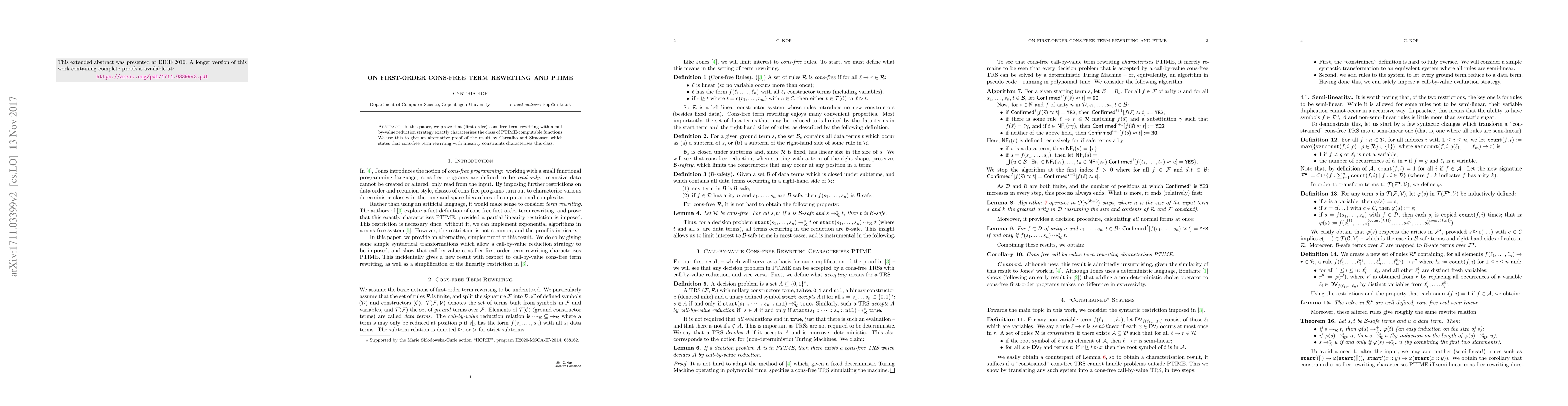 The paper provides an alternative proof that first-order cons-free term rewriting with a call-by-value reduction strategy exactly characterizes the class of PTIME-computable functions, using syntactical transformations and an algorithm.