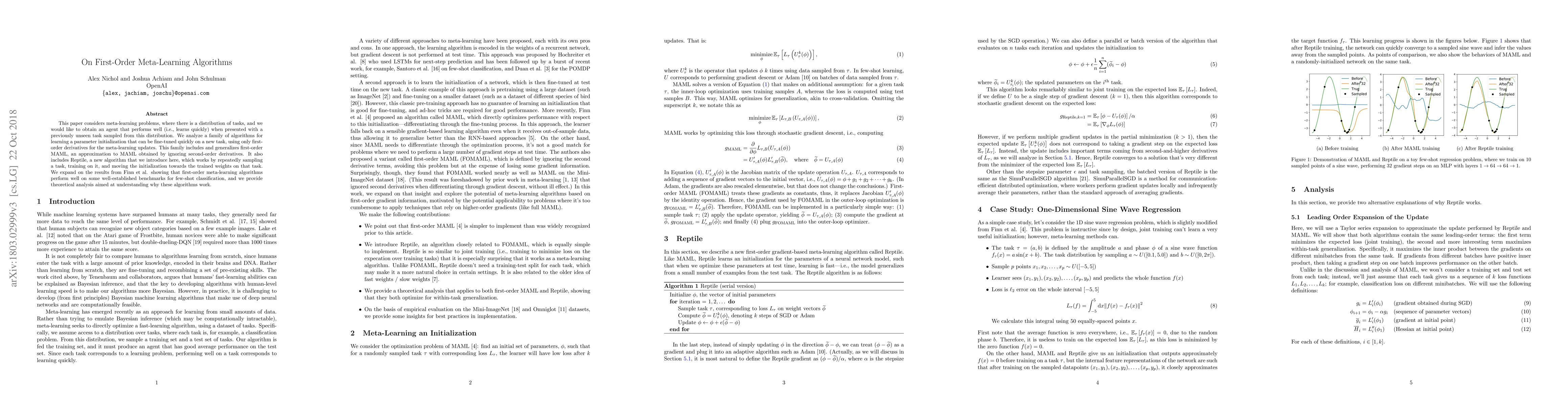 This paper analyzes first-order meta-learning algorithms, including a new method called Reptile, which aims to quickly adapt to new tasks using only first-order derivatives. It provides theoretical insights into why these algorithms perform well on few-shot classification benchmarks.