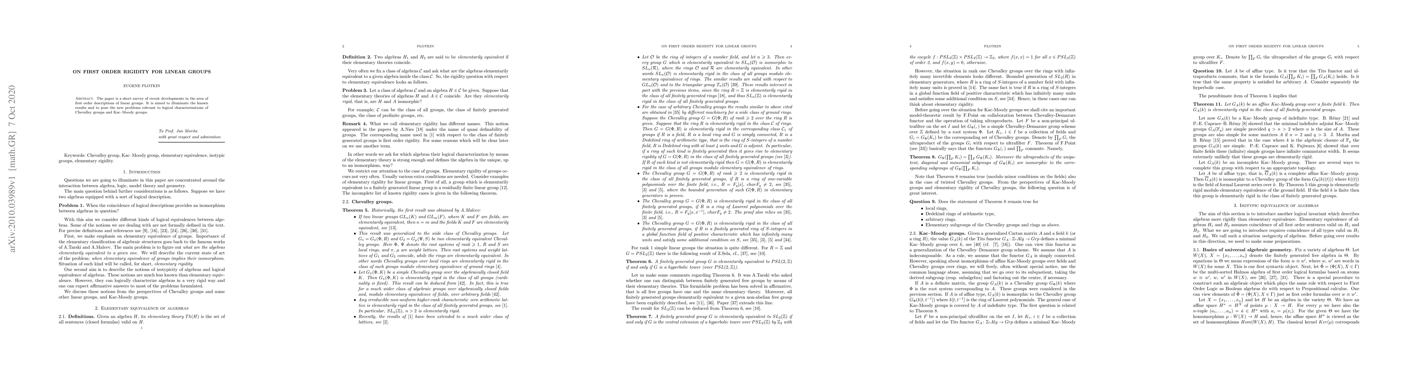 The paper is a short survey of recent developments in the area of first order descriptions of linear groups. It is aimed to illuminate the known results and to pose the new problems relevant to logical characterizations of Chevalley groups and Kac-Moody groups.