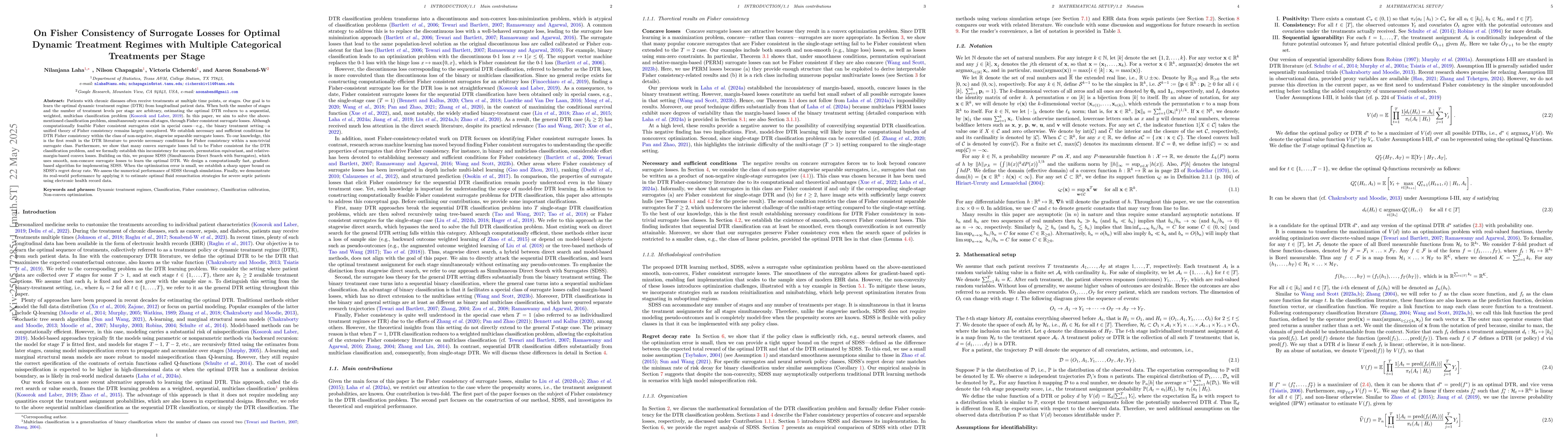 The paper establishes necessary and sufficient conditions for DTR Fisher consistency within the class of non-negative, stagewise separable surrogate losses, and proposes SDSS (Simultaneous Direct Search with Surrogates) using smooth, non-concave surrogate losses to learn the optimal DTR, accompanied by a computationally efficient, gradient-based algorithm.