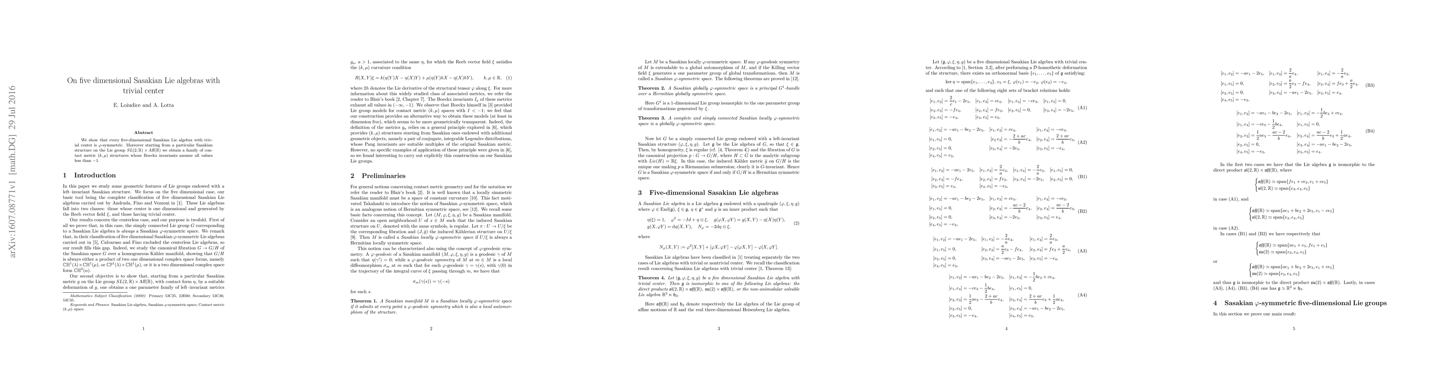Researchers show that five-dimensional Sasakian Lie algebras with a trivial center are symmetric under a particular transformation, leading to new contact metric structures with specific Boeckx invariants.