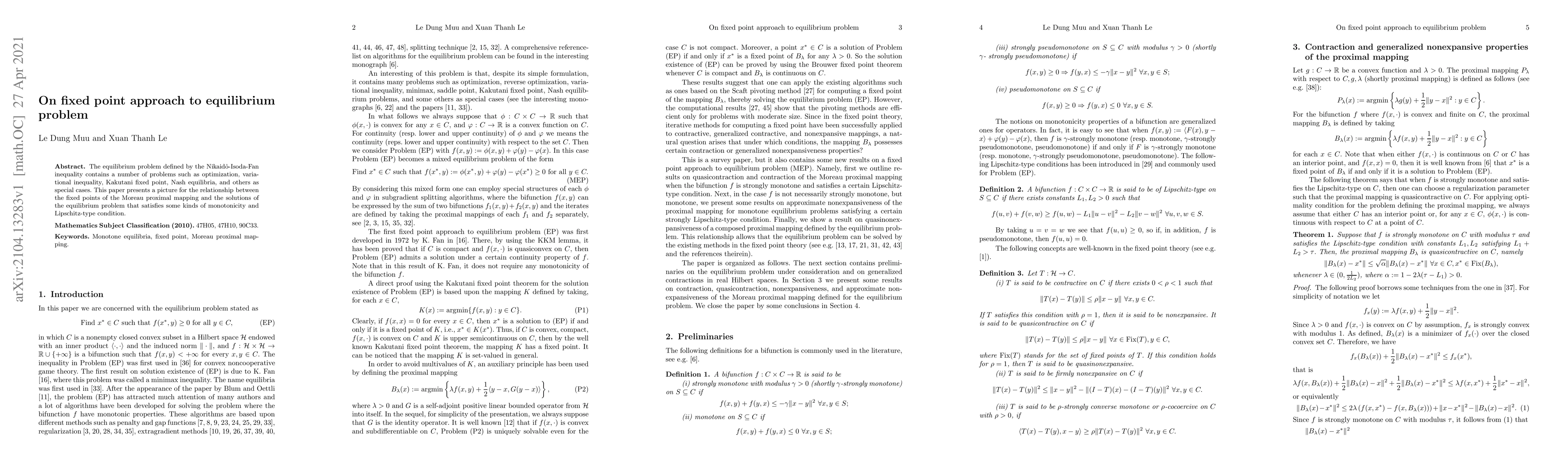 The equilibrium problem defined by the Nikaid\^o-Isoda-Fan inequality contains a number of problems such as optimization, variational inequality, Kakutani fixed point, Nash equilibria, and others as special cases. This paper presents a picture for the relationship between the fixed points of the Moreau proximal mapping and the solutions of the equilibrium problem that satisfies some kinds of monotonicity and Lipschitz-type condition.