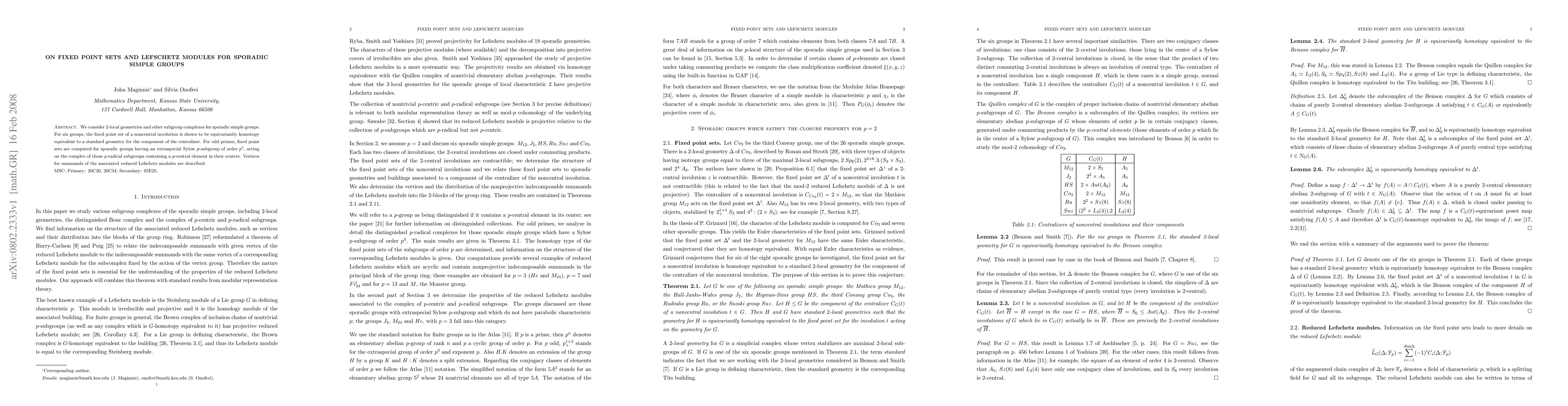 This paper explores the fixed point sets and Lefschetz modules for sporadic simple groups, demonstrating that for six specific groups, the fixed point set of a noncentral involution is equivariantly homotopy equivalent to a standard geometry. It also computes fixed point sets for groups with an extraspecial Sylow p-subgroup, describing vertices for summands of the associated reduced Lefschetz modules.