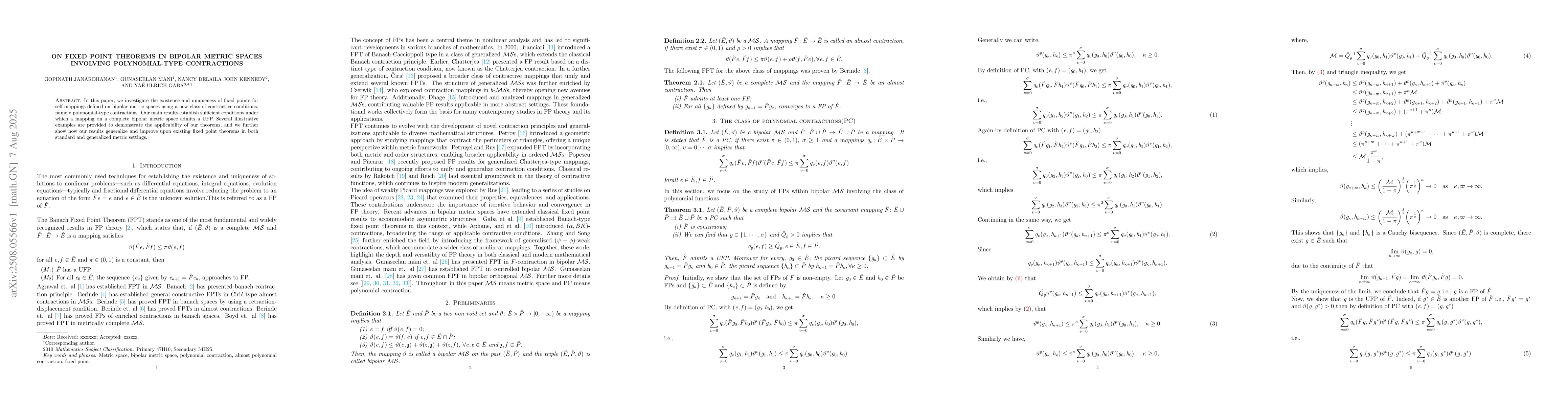 In this paper, we investigate the existence and uniqueness of fixed points for self-mappings defined on bipolar metric spaces using a new class of contractive conditions, namely polynomial-type contractions. Our main results establish sufficient conditions under which a mapping on a complete bipolar metric space admits a UFP. Several illustrative examples are provided to demonstrate the applicability of our theorems, and we further show how our results generalize and improve upon existing fixed point theorems in both standard and generalized metric settings.