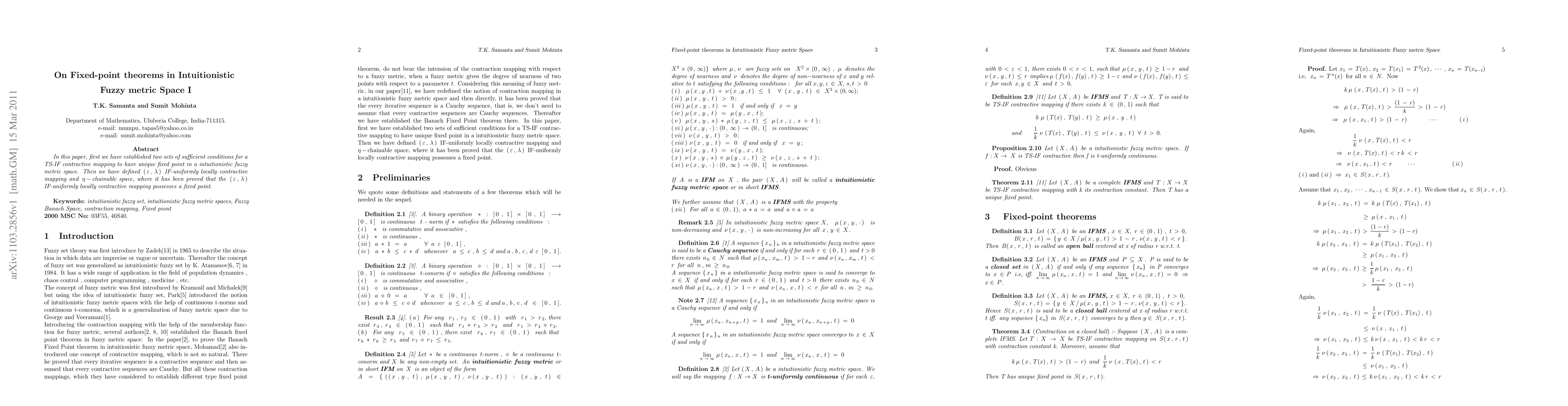In this paper, first we have established two sets of sufficient conditions for a TS-IF contractive mapping to have unique fixed point in a intuitionistic fuzzy metric space. Then we have defined \,$(\,\epsilon \,,\, \lambda\,)$\, IF-uniformly locally contractive mapping and \,$\eta\,-$\,chainable space, where it has been proved that the \,$(\,\epsilon \,,\, \lambda\,)$\, IF-uniformly locally contractive mapping possesses a fixed point
