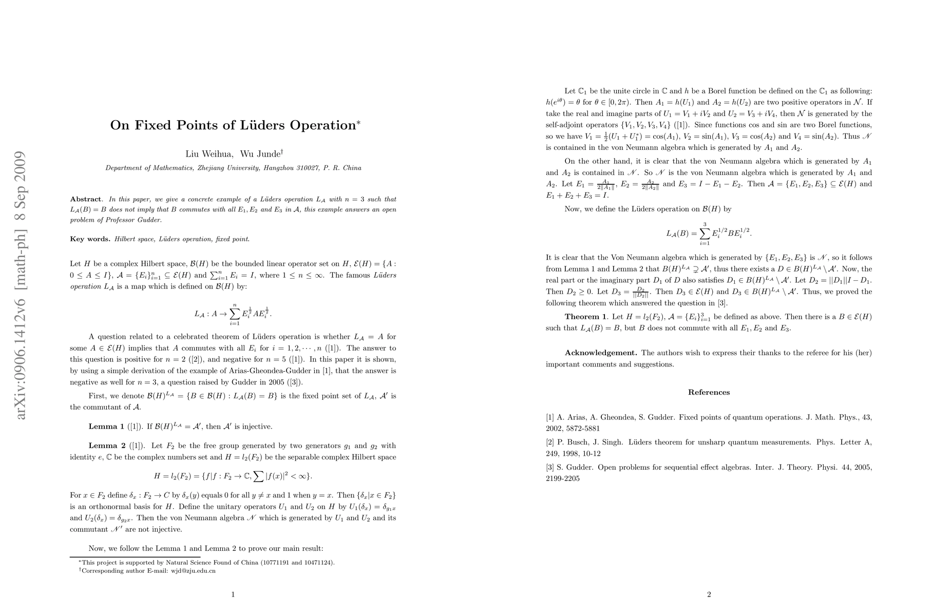 In this paper, we prove that if $\mathcal{A}=\{E_i\}_{i=1}^{n}$ is a finite commutative quantum measurement, then the fixed points set of L\"{u}ders operation $L_{{\cal A}}$ is the commutant ${\cal A}'$ of ${\cal A}$, the result answers an open problem partially. We also give a concrete example of a L\"{u}ders operation $L_{{\cal A}}$ with $n=3$ such that $L_{{\cal A}}(B)=B$ does not imply that the quantum effect $B$ commutes with all $E_1, E_2$ and $E_3$, this example answers another open problem.
