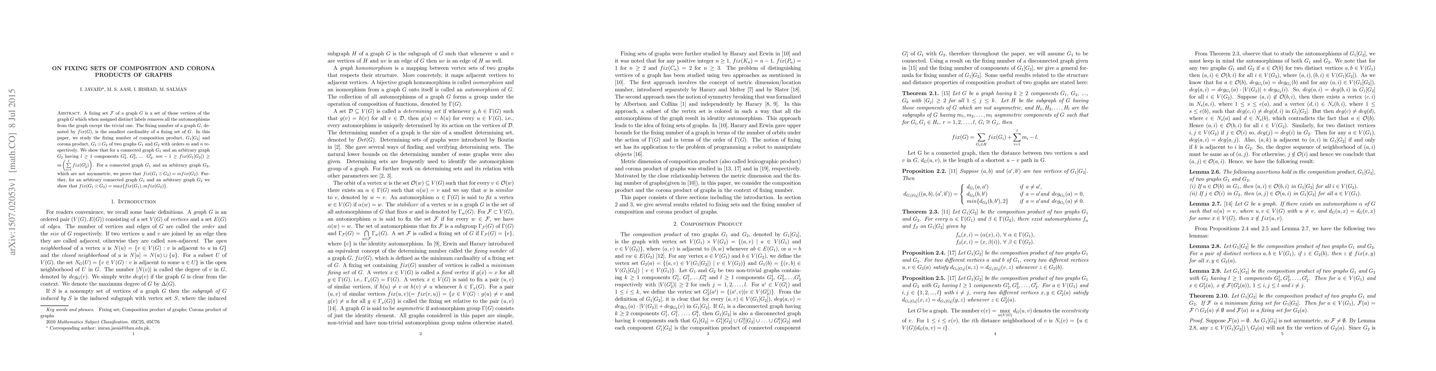 A fixing set $\mathcal{F}$ of a graph $G$ is a set of those vertices of the graph $G$ which when assigned distinct labels removes all the automorphisms from the graph except the trivial one. The fixing number of a graph $G$, denoted by $fix(G)$, is the smallest cardinality of a fixing set of $G$. In this paper, we study the fixing number of composition product, $G_1[G_2]$ and corona product, $G_1 \odot G_2$ of two graphs $G_1$ and $G_2$ with orders $m$ and $n$ respectively. We show that for a connected graph $G_1$ and an arbitrary graph $G_2$ having $l\geq 1$ components $G_2^1$, $G_2^2$, ... $G_2^l,$ $mn-1\geq fix(G_1[G_2])\geq m\left(\sum \limits_{i=1}^{l} fix(G_2^i )\right)$. For a connected graph $G_1$ and an arbitrary graph $G_2$, which are not asymmetric, we prove that $fix(G_1\odot G_2)=m fix( G_2)$. Further, for an arbitrary connected graph $G_{1}$ and an arbitrary graph $G_{2}$ we show that $fix(G_1\odot G_2)= max\{fix(G_1), m fix(G_2)\}$.