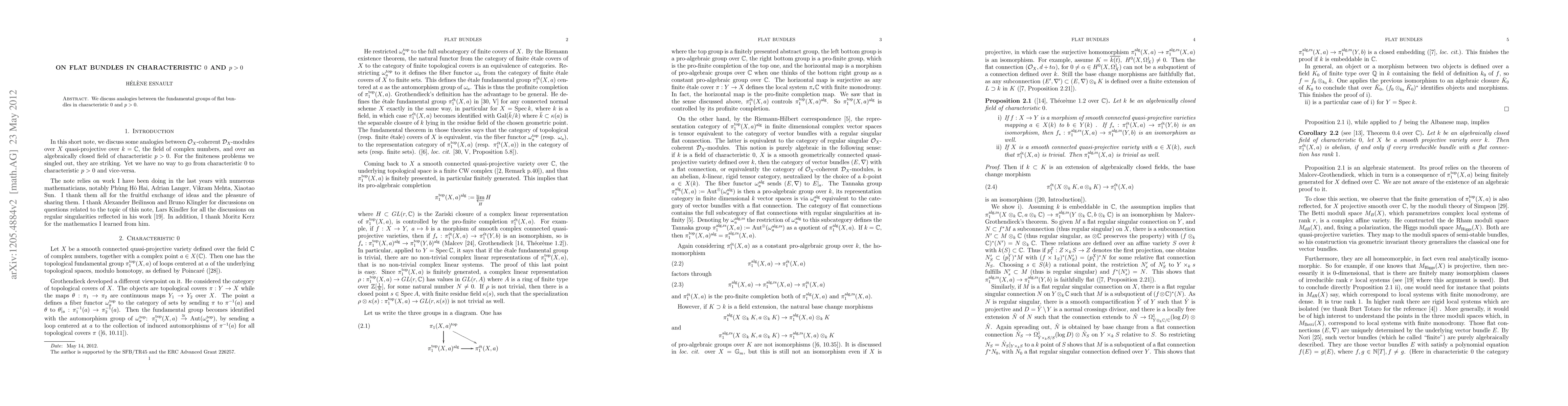 We discuss analogies between the fundamental groups of flat bundles in characteristic 0 and $p>0$ (contribution to the ECM 2012 volume)