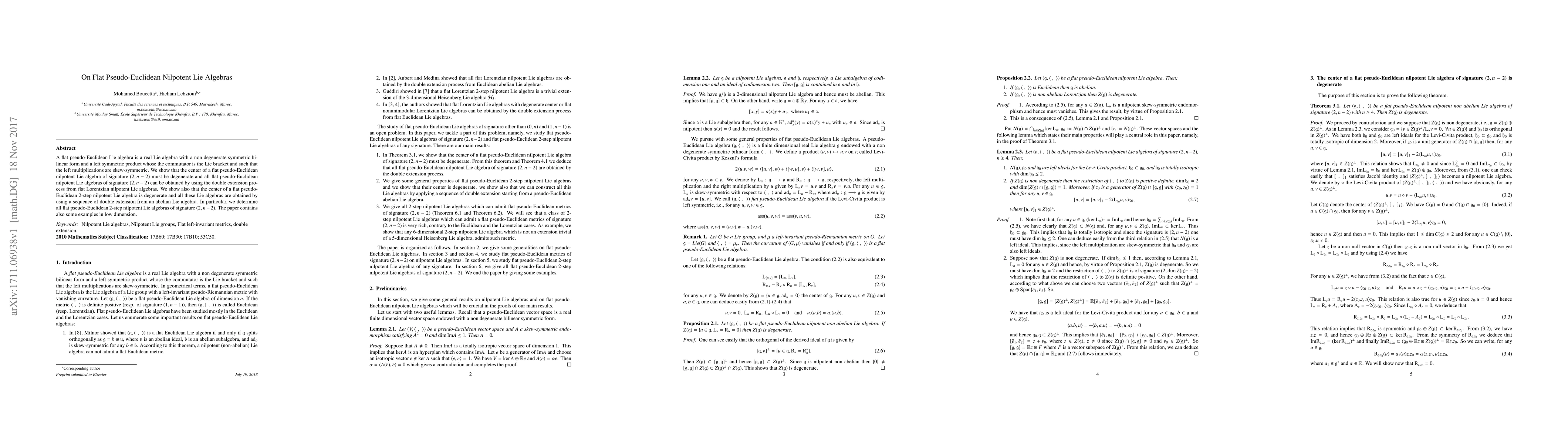 This research explores flat pseudo-Euclidean nilpotent Lie algebras, proving that their centers are degenerate under specific signatures and demonstrating their construction via double extension processes from simpler Lie algebras. It also determines all flat pseudo-Euclidean 2-step nilpotent Lie algebras of a given signature.