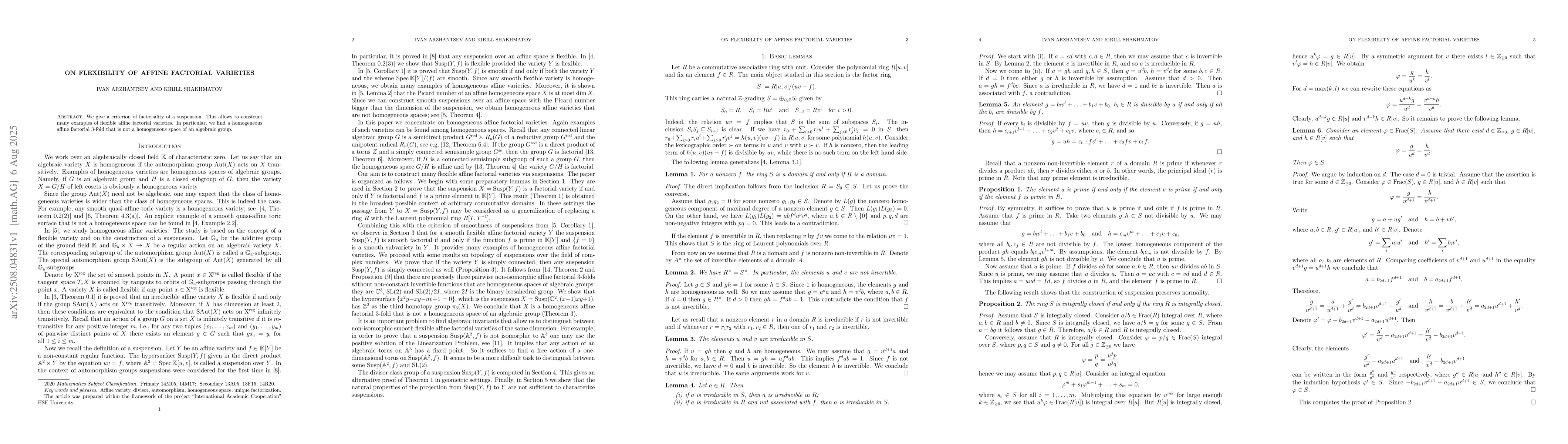 We give a criterion of factoriality of a suspension. This allows to construct many examples of flexible affine factorial varieties. In particular, we find a homogeneous affine factorial 3-fold that is not a homogeneous space of an algebraic group.