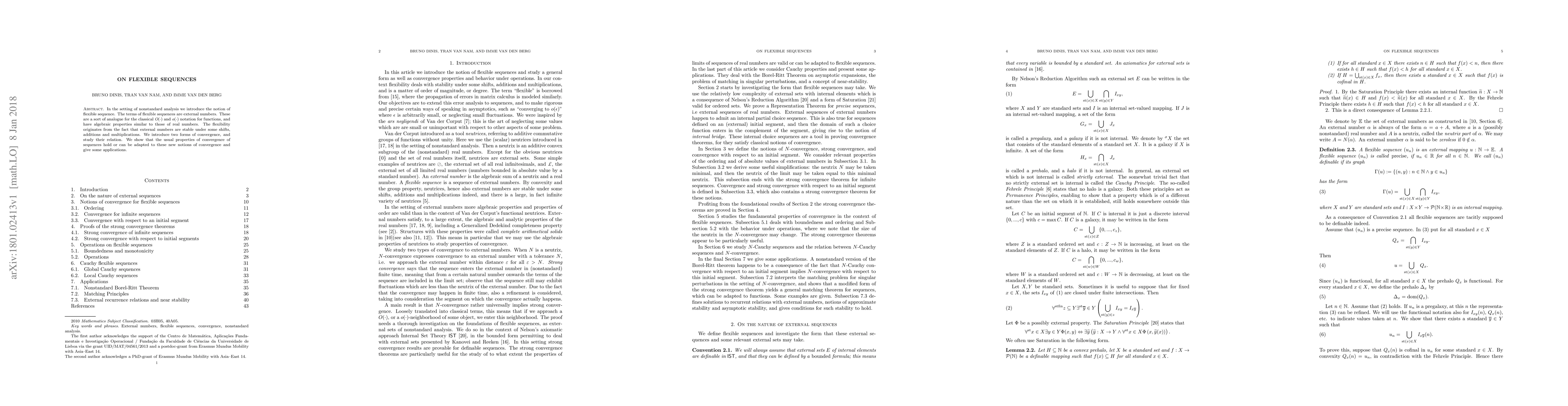 In the setting of nonstandard analysis we introduce the notion of flexible sequence. The terms of flexible sequences are external numbers. These are a sort of analogue for the classical \emph{O$ (\cdot ) $} and \emph{o$ (\cdot ) $} notation for functions, and have algebraic properties similar to those of real numbers. The flexibility originates from the fact that external numbers are stable under some shifts, additions and multiplications. We introduce two forms of convergence, and study their relation. We show that the usual properties of convergence of sequences hold or can be adapted to these new notions of convergence and give some applications.
