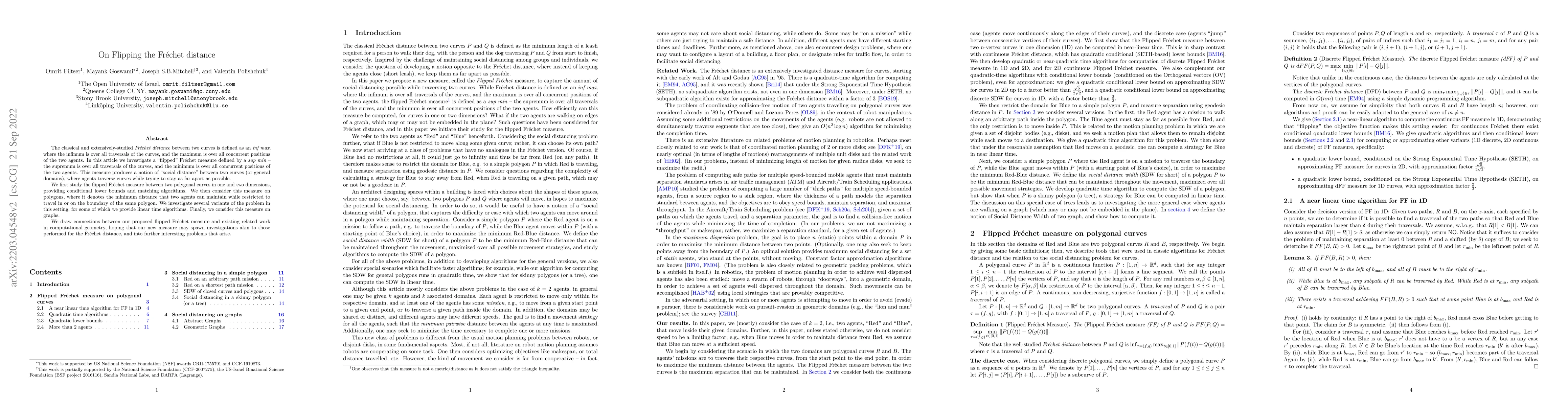 This paper introduces a "flipped" Fréchet distance, defined as a supremum over traversals and a minimum over positions, representing a "social distance" where agents attempt to stay apart. The authors study this measure for polygonal curves and graphs, providing algorithms and connections to existing computational geometry research.
