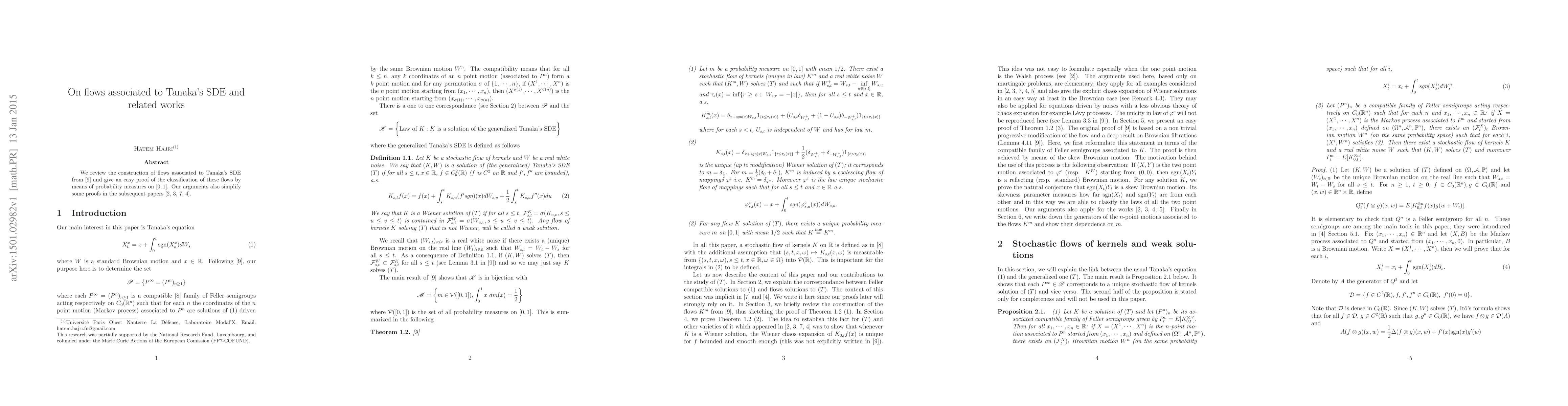 We review the construction of flows associated to Tanaka's SDE from [9] and give an easy proof of the classification of these flows by means of probability measures on [0, 1]. Our arguments also simplify some proofs in the subsequent papers [2, 3, 7, 4].