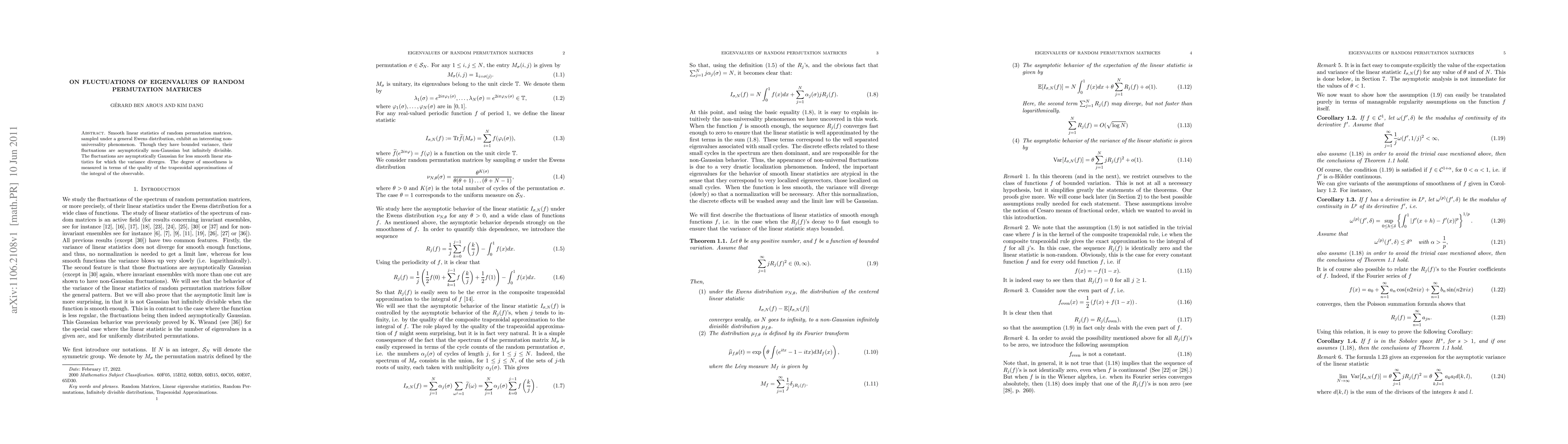 This paper investigates the fluctuations of eigenvalues in random permutation matrices under an Ewens distribution, revealing that while variance is bounded, fluctuations are non-Gaussian yet infinitely divisible for smooth linear statistics. For less smooth statistics, fluctuations become asymptotically Gaussian despite diverging variance.