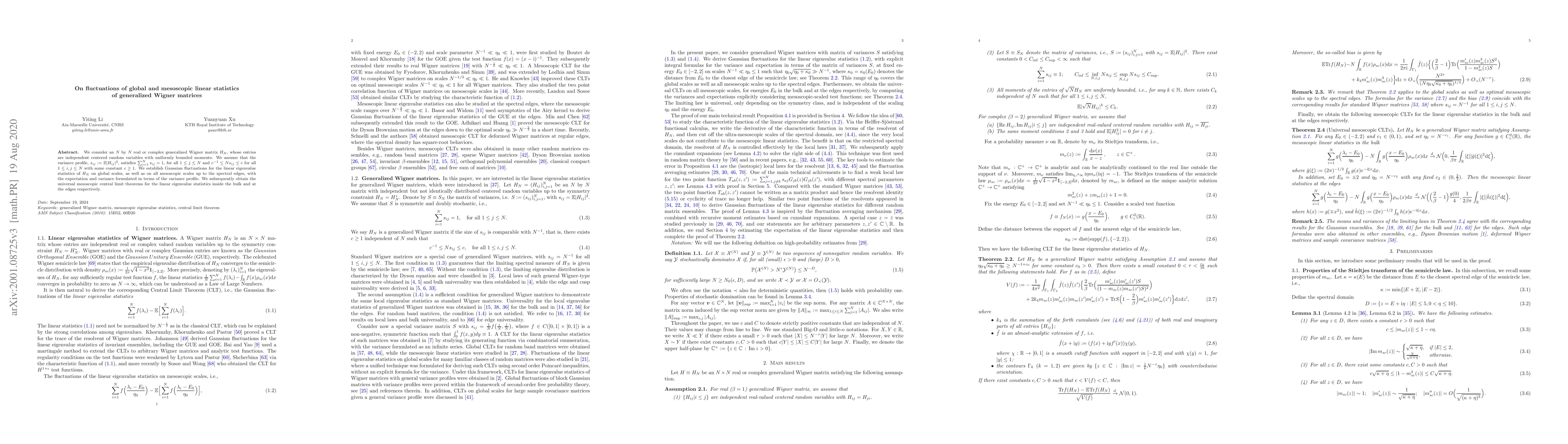 This paper investigates Gaussian fluctuations in the linear eigenvalue statistics of generalized Wigner matrices, establishing results for both global and mesoscopic scales, and deriving universal central limit theorems based on the variance profile.