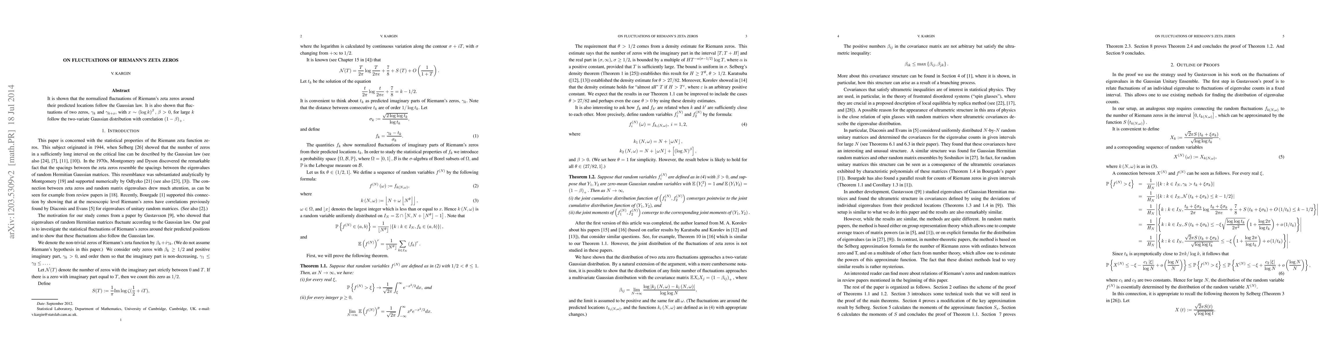 This paper demonstrates that the normalized fluctuations of Riemann's zeta zeros adhere to a Gaussian distribution and that the fluctuations between two zeros separated by a distance proportional to $(\log k)^{\beta}$ for large $k$ follow a two-variate Gaussian distribution with a correlation of $(1-\beta)_{+}$.