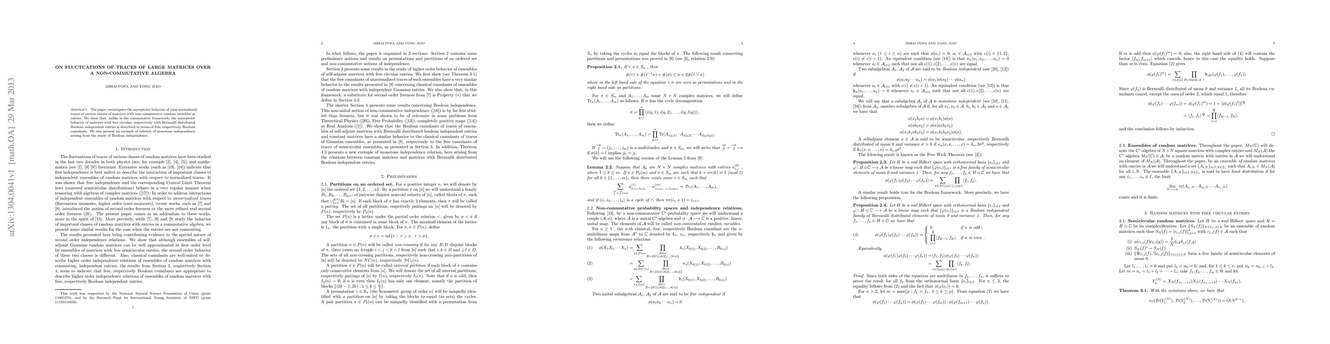 Summary: This paper examines the asymptotic behavior of traces of large matrices with non-commutative random variables, revealing that their behavior is characterized by free or Boolean cumulants, unlike commutative matrices. It also explores the connection between monotone and Boolean independence in this context.