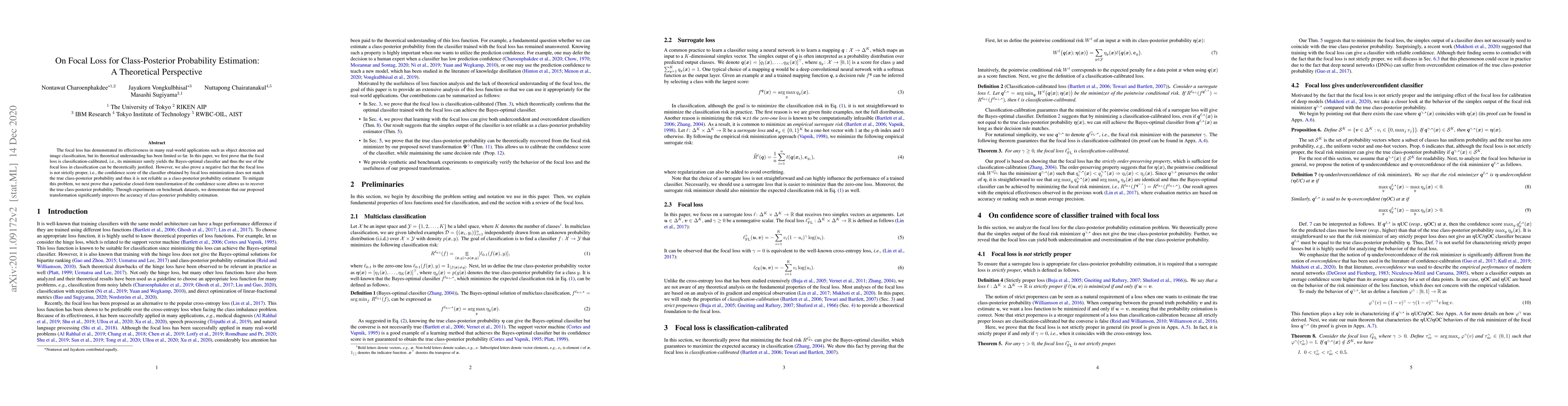 This paper theoretically justifies the use of focal loss in classification by proving it is classification-calibrated, but notes it is not strictly proper for estimating class-posterior probabilities. It proposes a transformation of the confidence score to recover true class-posterior probabilities, which is shown to improve estimation accuracy in experiments.