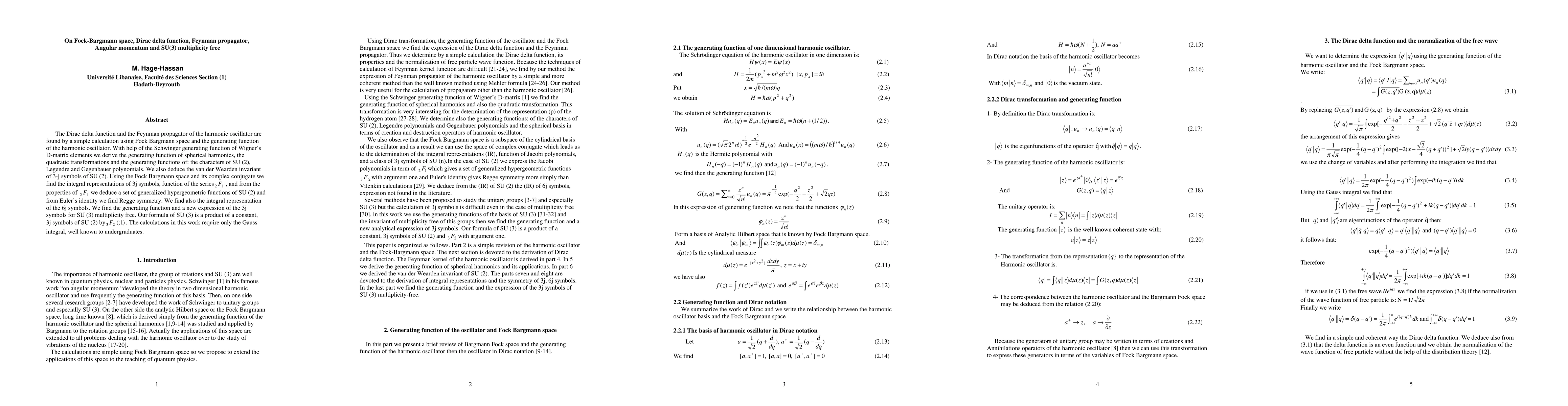 The Dirac delta function and the Feynman propagator of the harmonic oscillator are found by a simple calculation using Fock Bargmann space and the generating function of the harmonic oscillator. With help of the Schwinger generating function of Wigner's D-matrix elements we derive the generating function of spherical harmonics, the quadratic transformations and the generating functions of: the characters of SU (2), Legendre and Gegenbauer polynomials. We also deduce the van der Wearden invariant of 3-j symbols of SU (2). Using the Fock Bargmann space and its complex conjugate we find the integral representations of 3j symbols, function of the series, and from the properties of we deduce a set of generalized hypergeometric functions of SU (2) and from Euler's identity we find Regge symmetry. We find also the integral representation of the 6j symbols. We find the generating function and a new expression of the 3j symbols for SU (3) multiplicity free. Our formula of SU (3) is a product of a constant, 3j symbols of SU (2) by . The calculations in this work require only the Gauss integral, well known to undergraduates.