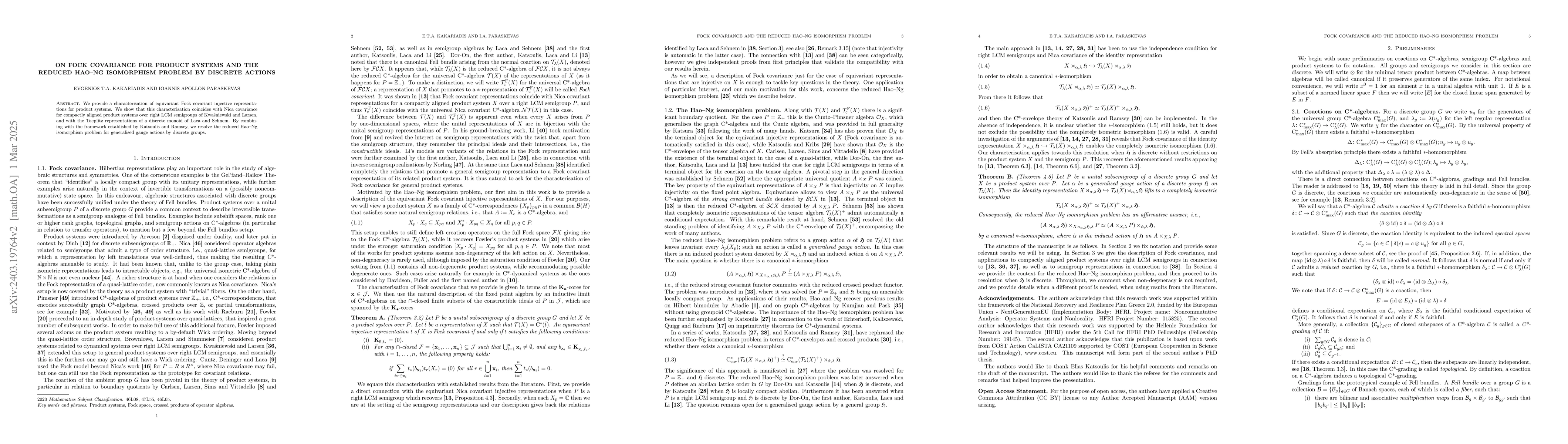 This paper characterizes equivariant Fock covariant representations for product systems, establishing their equivalence with Nica covariance and Toeplitz representations. It also resolves the reduced Hao-Ng isomorphism problem for generalised gauge actions by discrete groups.