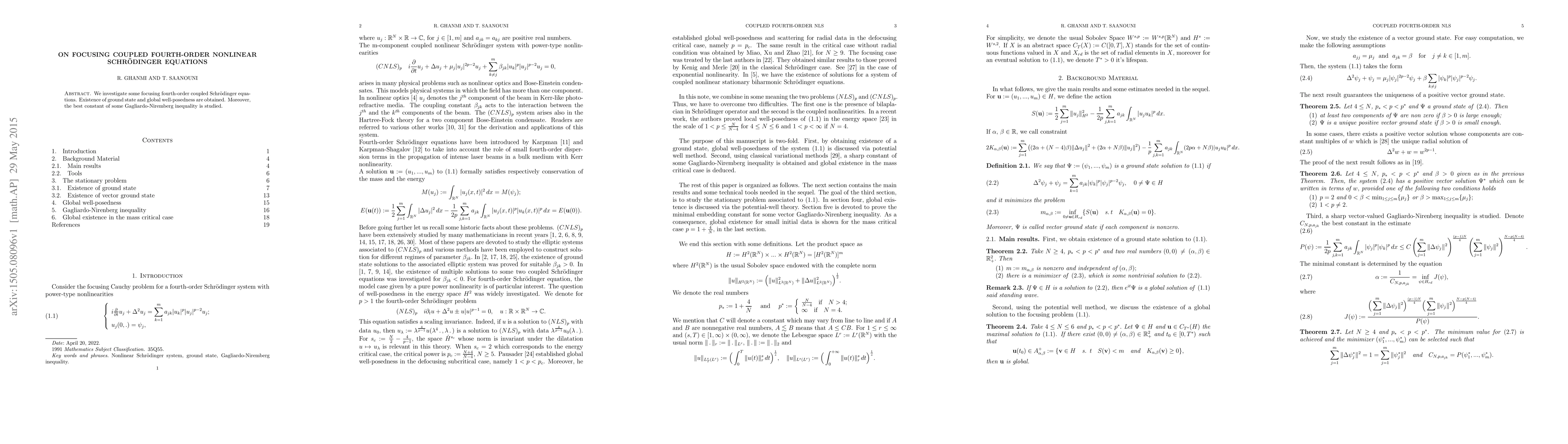 This research investigates focusing fourth-order coupled Schrodinger equations, proving existence of ground states and global well-posedness, while also studying the best constant in a Gagliardo-Nirenberg inequality.