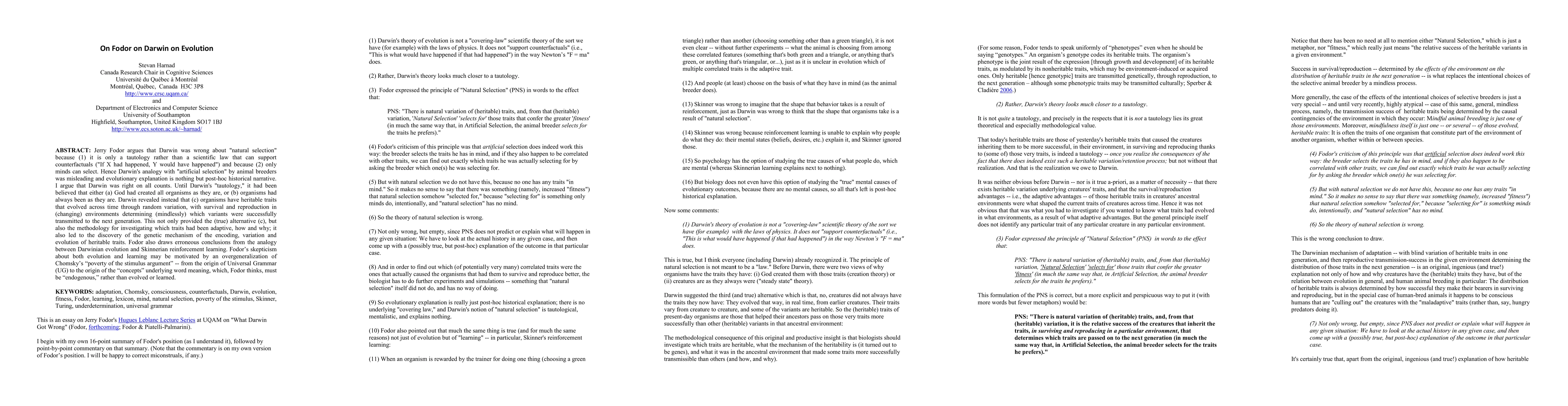 Summary: Jerry Fodor contends that Darwin's concept of natural selection is flawed, arguing it's a tautology and only minds can truly select. However, the paper counters that Darwin's theory holds up as a robust scientific explanation of evolution.