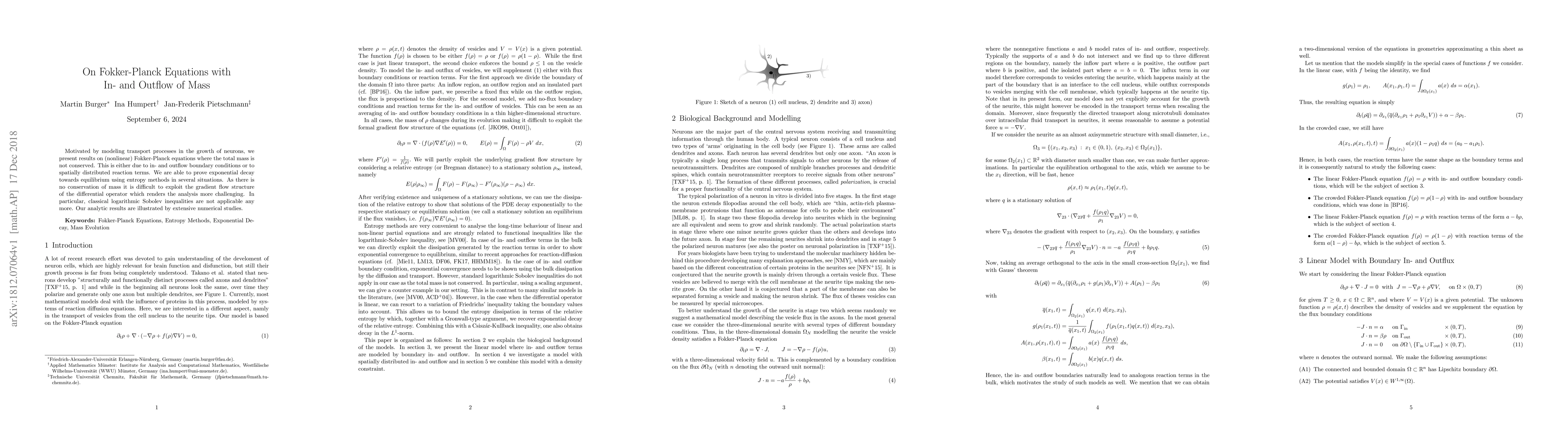 Motivated by modeling transport processes in the growth of neurons, we present results on (nonlinear) Fokker-Planck equations where the total mass is not conserved. This is either due to in- and outflow boundary conditions or to spatially distributed reaction terms. We are able to prove exponential decay towards equilibrium using entropy methods in several situations. As there is no conservation of mass it is difficult to exploit the gradient flow structure of the differential operator which renders the analysis more challenging. In particular, classical logarithmic Sobolev inequalities are not applicable any more. Our analytic results are illustrated by extensive numerical studies.