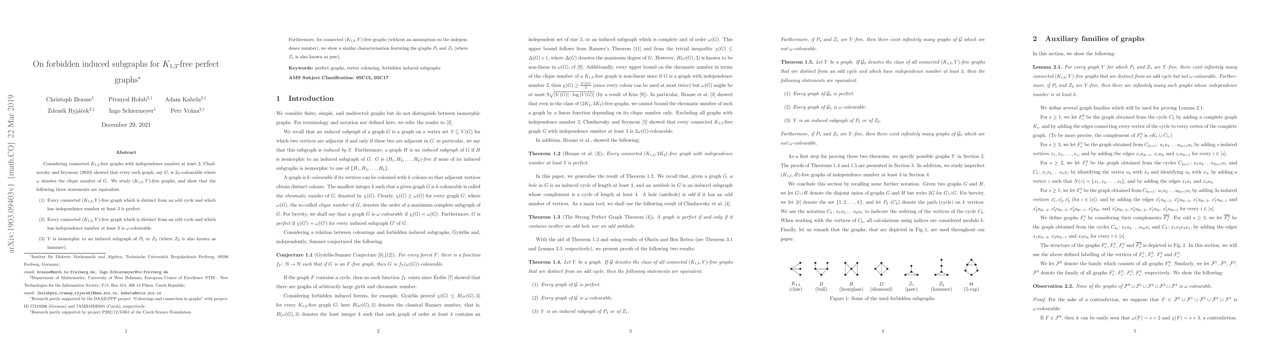 This paper investigates $(K_{1,3}, Y)$-free graphs, proving that certain conditions on independence number and graph structure lead to perfectness and $\omega$-colourability, and identifies $Y$ as an induced subgraph of $P_5$ or $Z_2$ for these properties to hold.